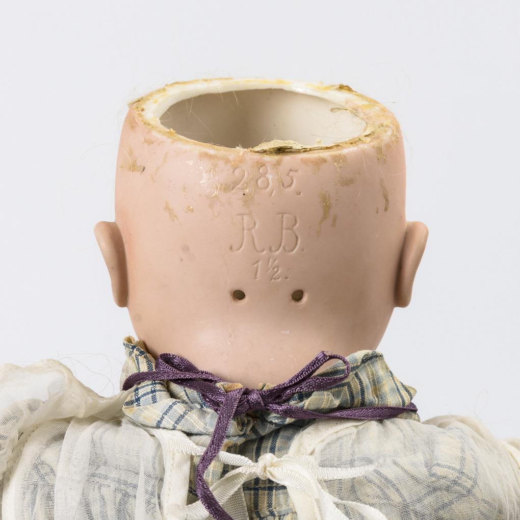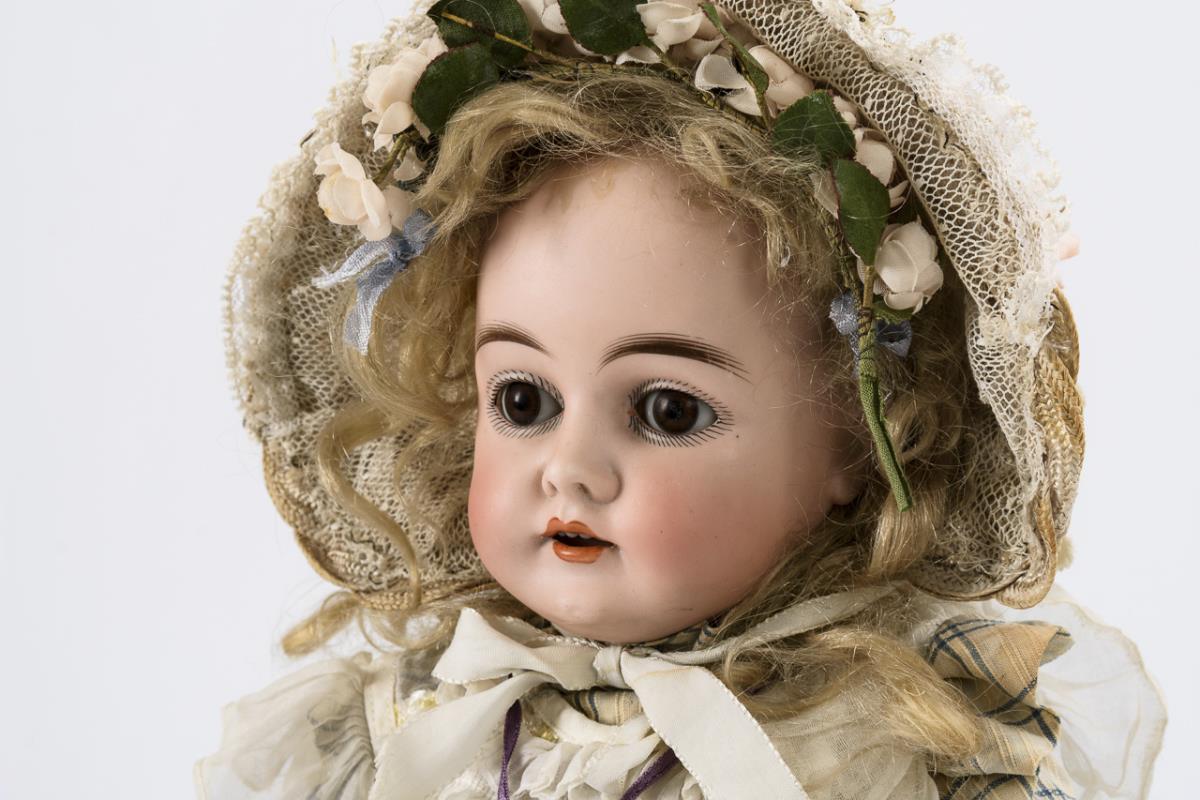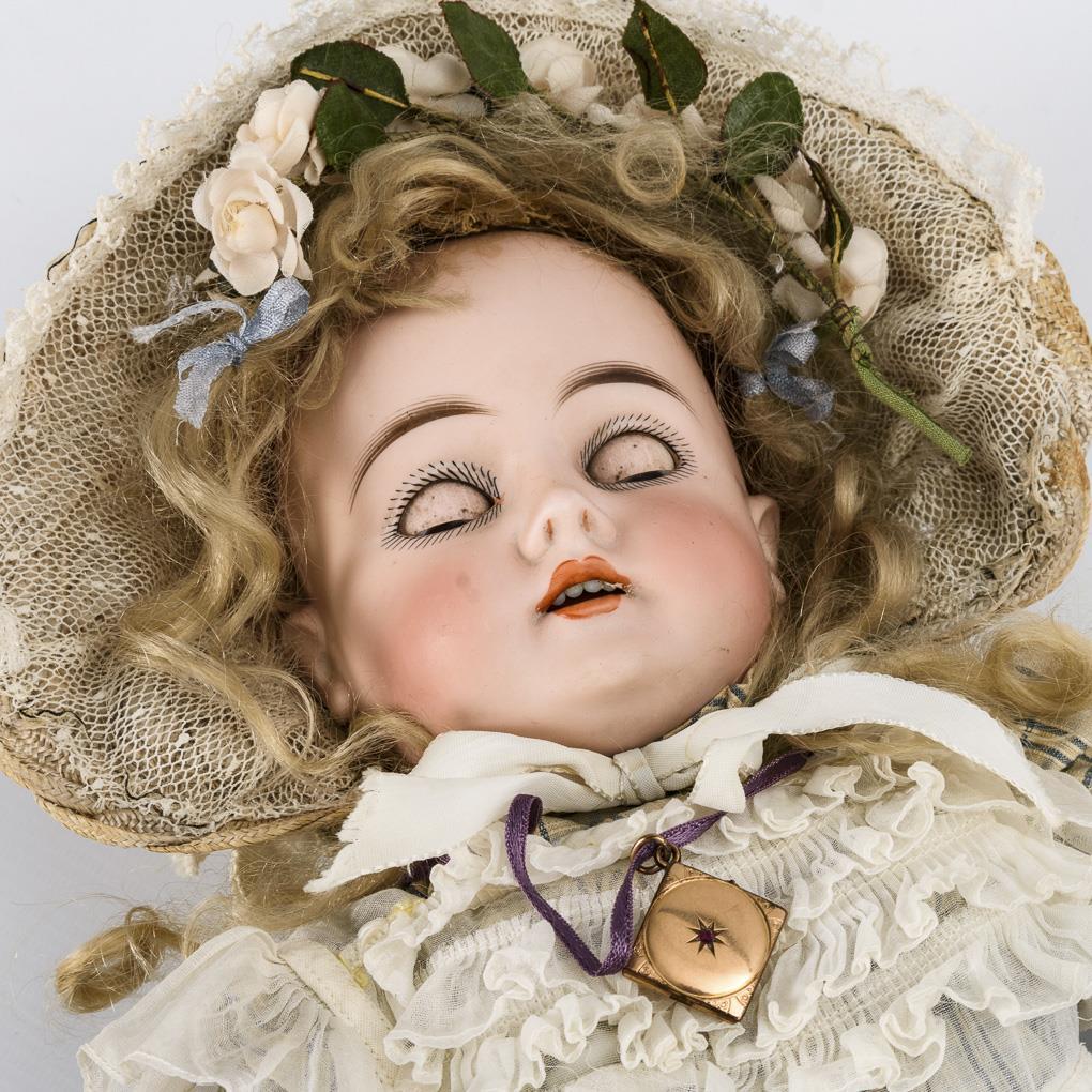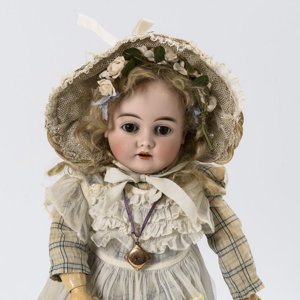 Kurbelkopf, braune Schlafaugen, blonde Mohairperücke. 15-teiliger Gliederkörper. Kariertes Kleid, Schutenhut, Haarkranz. Kopf durchleuchtet: ohne Defekte.