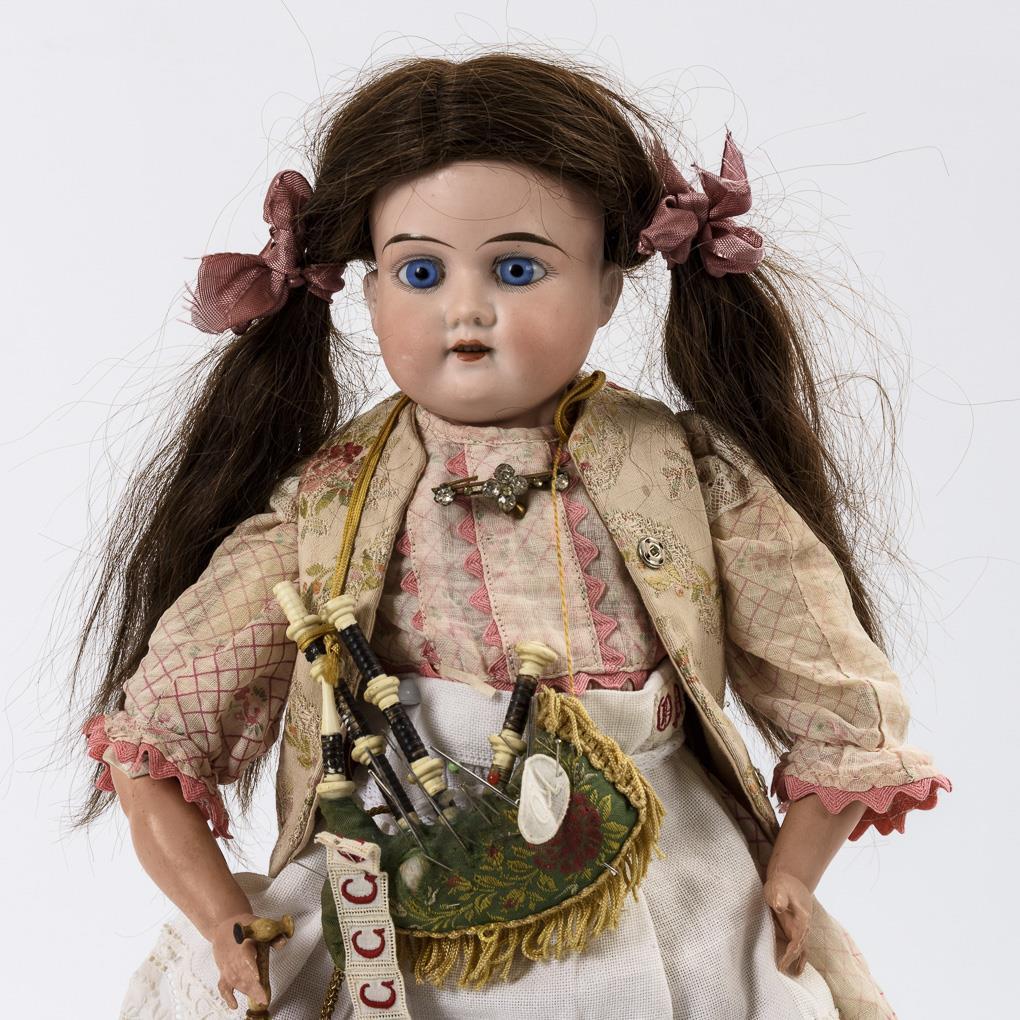 Dazu rotes Nadelkissen mit Perlstickerei und altes Nadelkissen als Dudelsack. Kopf durchleuchtet: ohne Defekte. Beine mit wohl ergänzten Unterschenkeln.