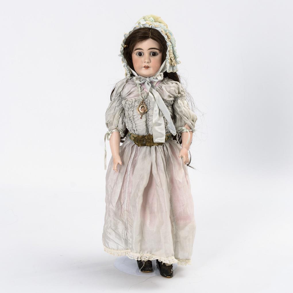 Kopf mit fest vergipstem Deckel, feste braune Glasaugen, lange schwarze Echthaarperücke. Lederkörper mit Biskuit-Unterarmen. Hellblaues Kleid mit Perlstickerei-Gürtel, Jugendstilanhänger, Häubchen und alte schwarze Wachstuchschuhe. Kopf nicht durchleuchtet, jedoch keine Defekte sichtbar. Rechter Fuß mit Reparatur.