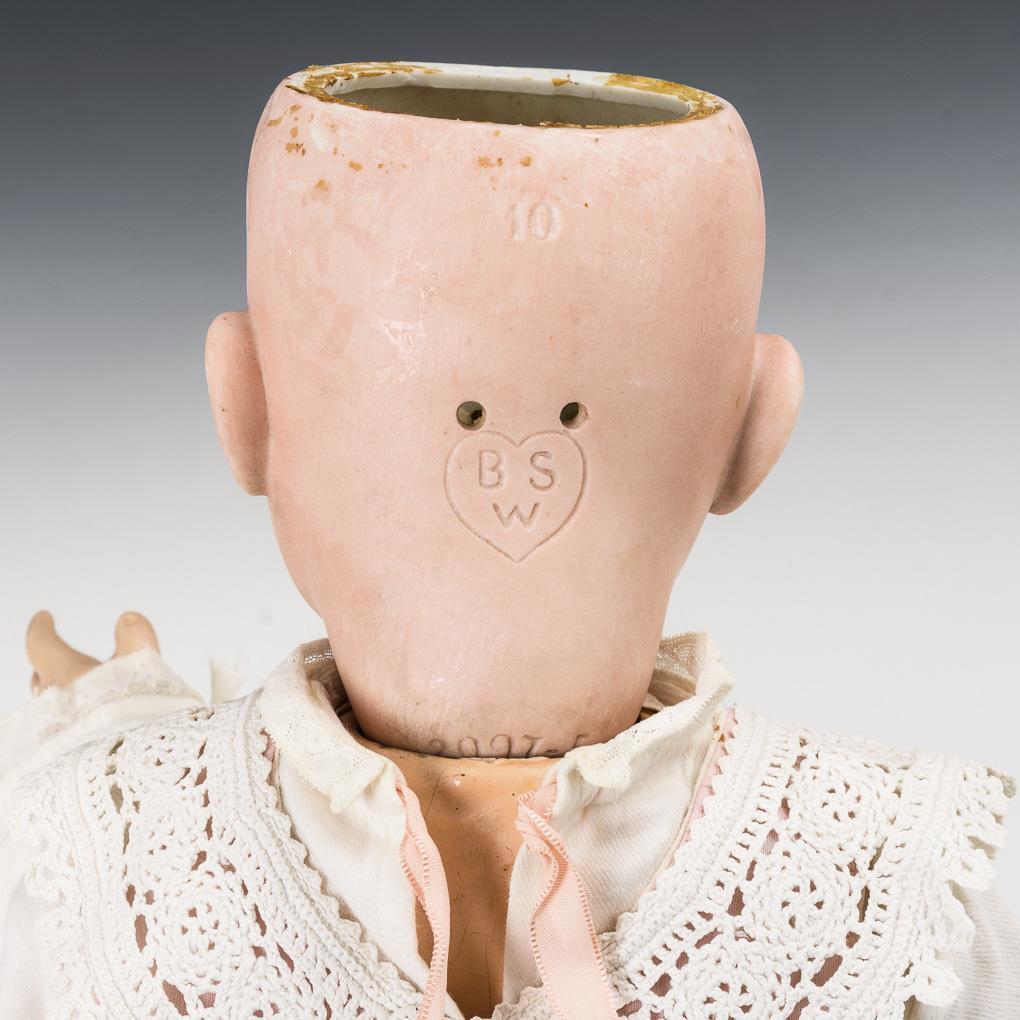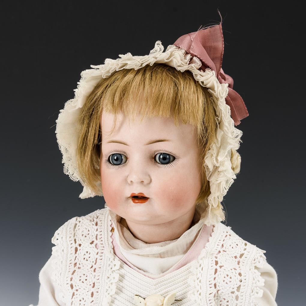 Kurbelkopf, festgegipste blaue Augen, Echthaarperücke. 7-teiliger Sitzbabykörper mit beweglichen Handgelenken. Rosa Hose, weißes Häkellätzchen, Brosche mit Engelchen, schönes altes Häubchen. Kaum sichtbarer Haarriss an der Stirn, winziger Haarriss am Hinterkopf, Hände und Handgelenke übermalt.