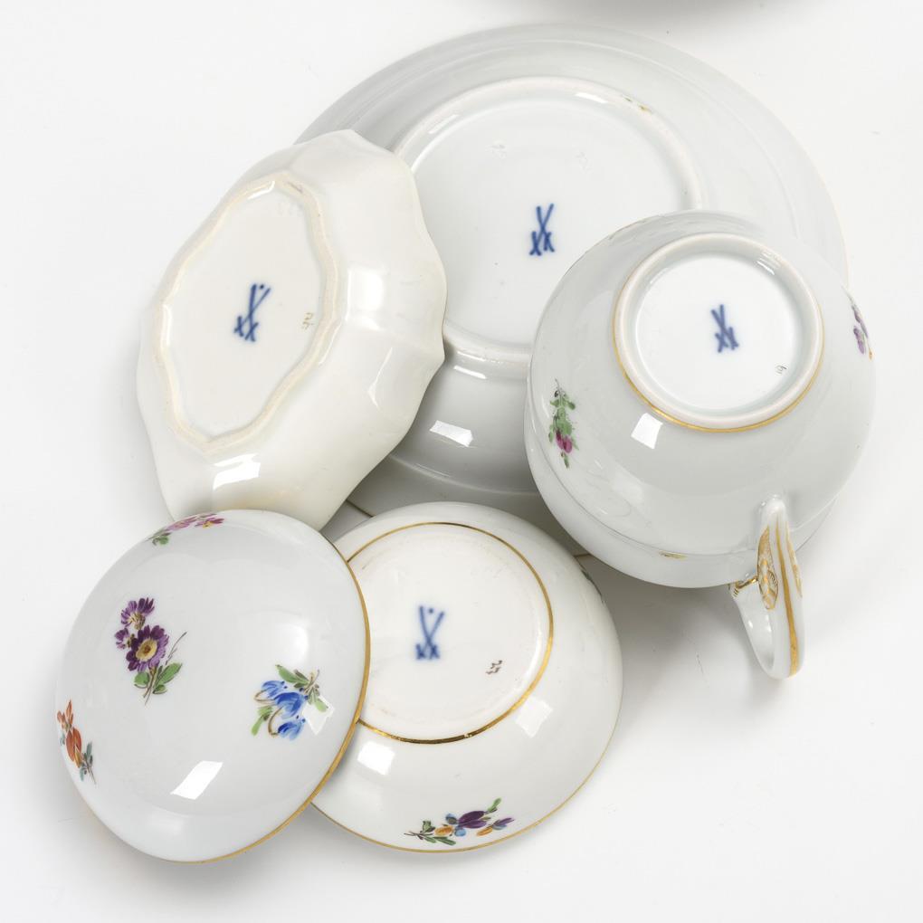 2 Tassen, Schälchen und Dose mit Streublümchenmalerei. Meissen.