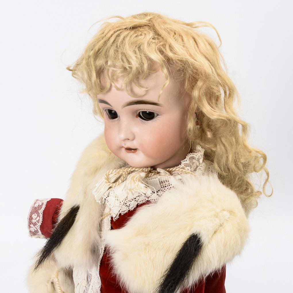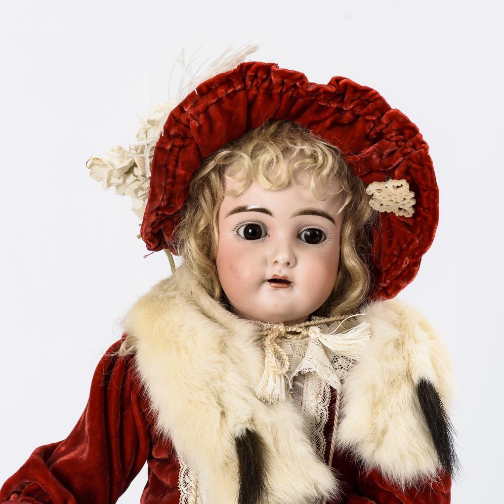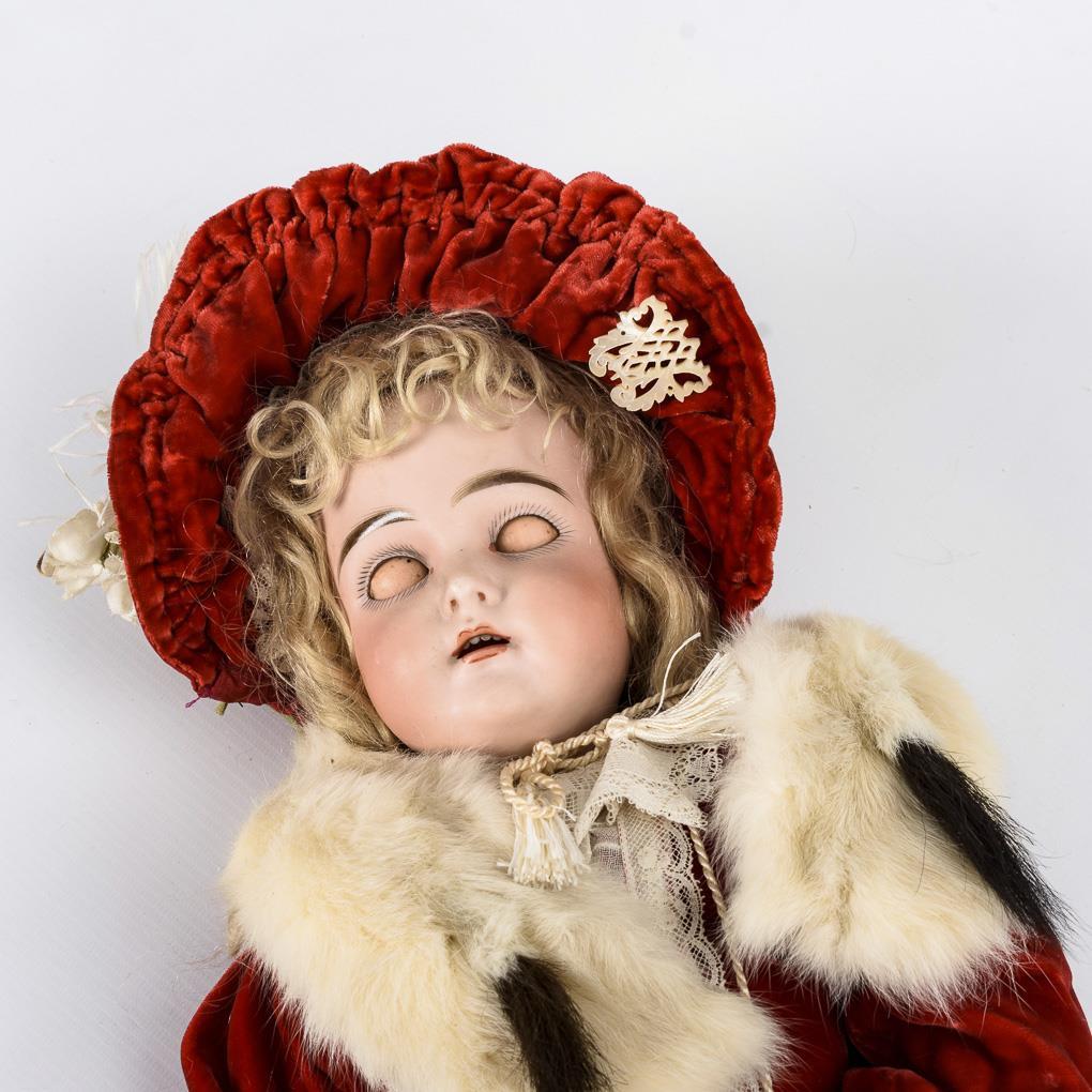 Kurbelkopf, braune Schlafaugen, Ohrringe, blonde Mohairperücke. 15-teiliger Gliederkörper. Rotes Samtkleid, passender Schutenhut, Hermelin-Schal und -Muff, rote Wachstuchschuhe. Kopf durchleuchtet: ohne Defekte.