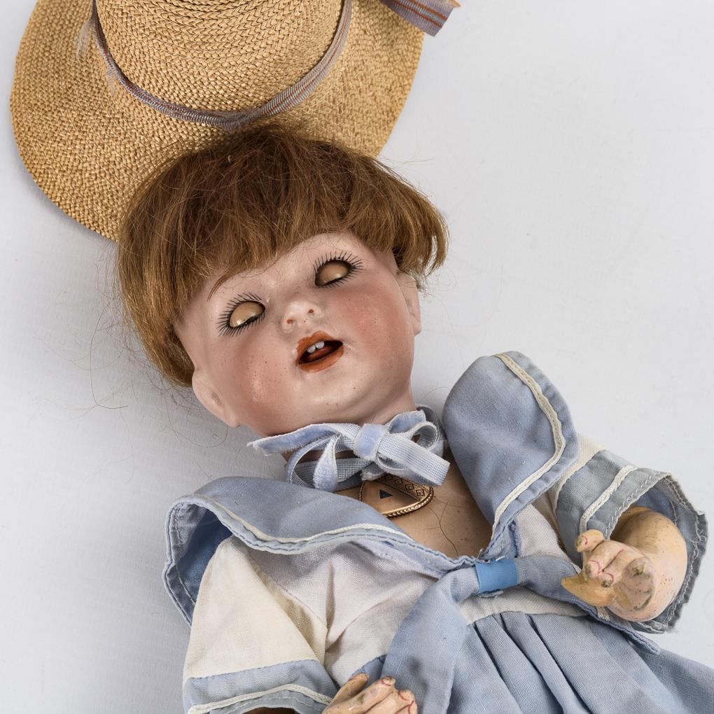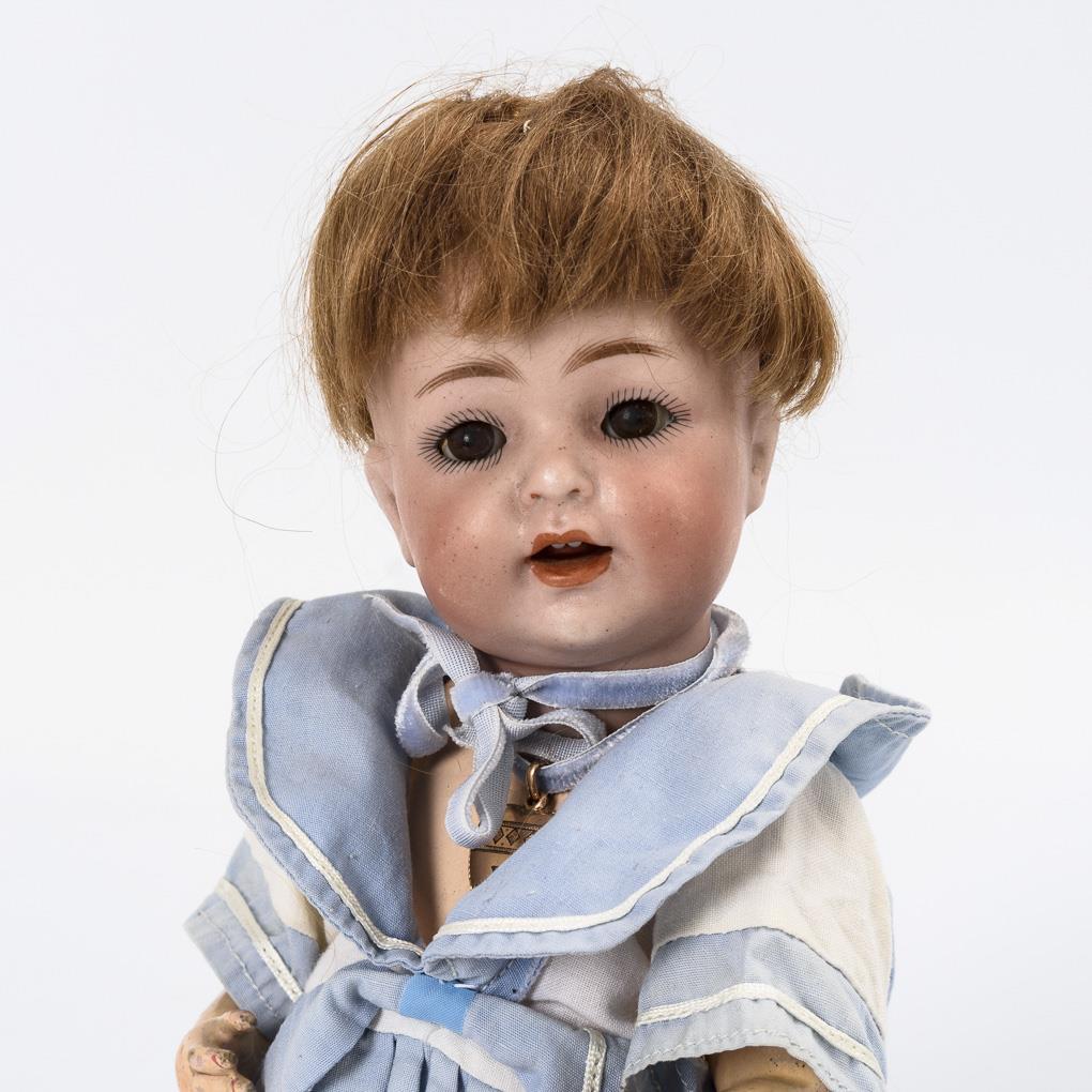Kurbelkopf, braune Schlafaugen, rotbraune Mohairperücke. 5-teiliger Sitzbabykörper. Blaues Matrosenkleidchen, Schutenhut. Chip und Haarriss am Hinterkopf, Kopfaufhängung jünger erneuert, Hände mit Reparaturen.