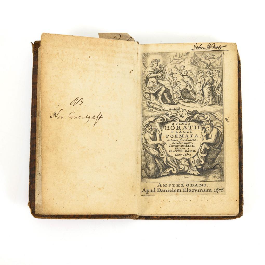 Titelkupfer, 234, (3) Seiten. die Kommentare zu den Gedichten von Horaz sind jeweils auf der gleichen Seite in abgesetzter Typographie. Wohl Ledereinband des 18. Jahrhunderts. Nutzungsspuren, im Vorsatz handschriftlicher Eintrag.