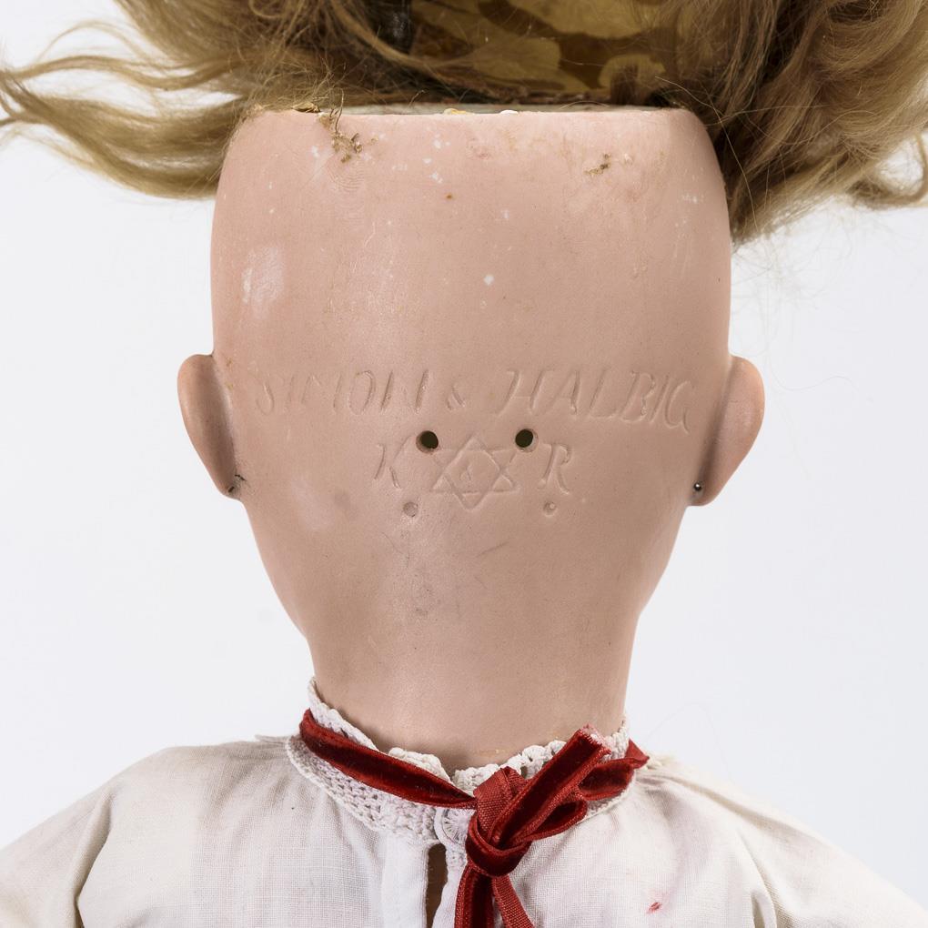 Kurbelkopf, blaue Schlafaugen, schöne alte Ohrringe, blonde Mohairperücke. 15-teiliger Gliederkörper. Weißes Kleid, roter Samthut, alte Kinderschuhe. Langer Haarriss vom Hinterkopf bis zum Kinn. Beine mit übermalten Farbdefekten, 1 Finger rechts repariert.