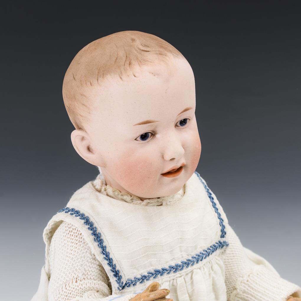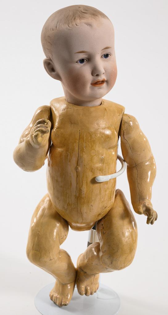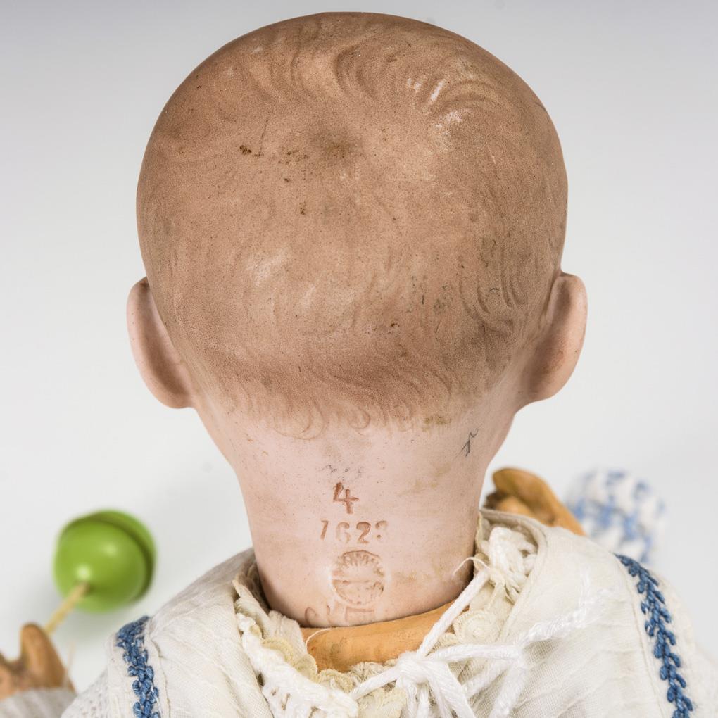 Kurbelkopf, blaue Intaglio-Augen, offen/geschlossener Mund, braun getönter Haarboden. 5-teiliger Sitzbabykörper. Weißes Kleid, blaues Mützchen, Nuckelflasche. Kopf ohne sichtbare Defekte, Körper farbrissig mit Übermalungen.