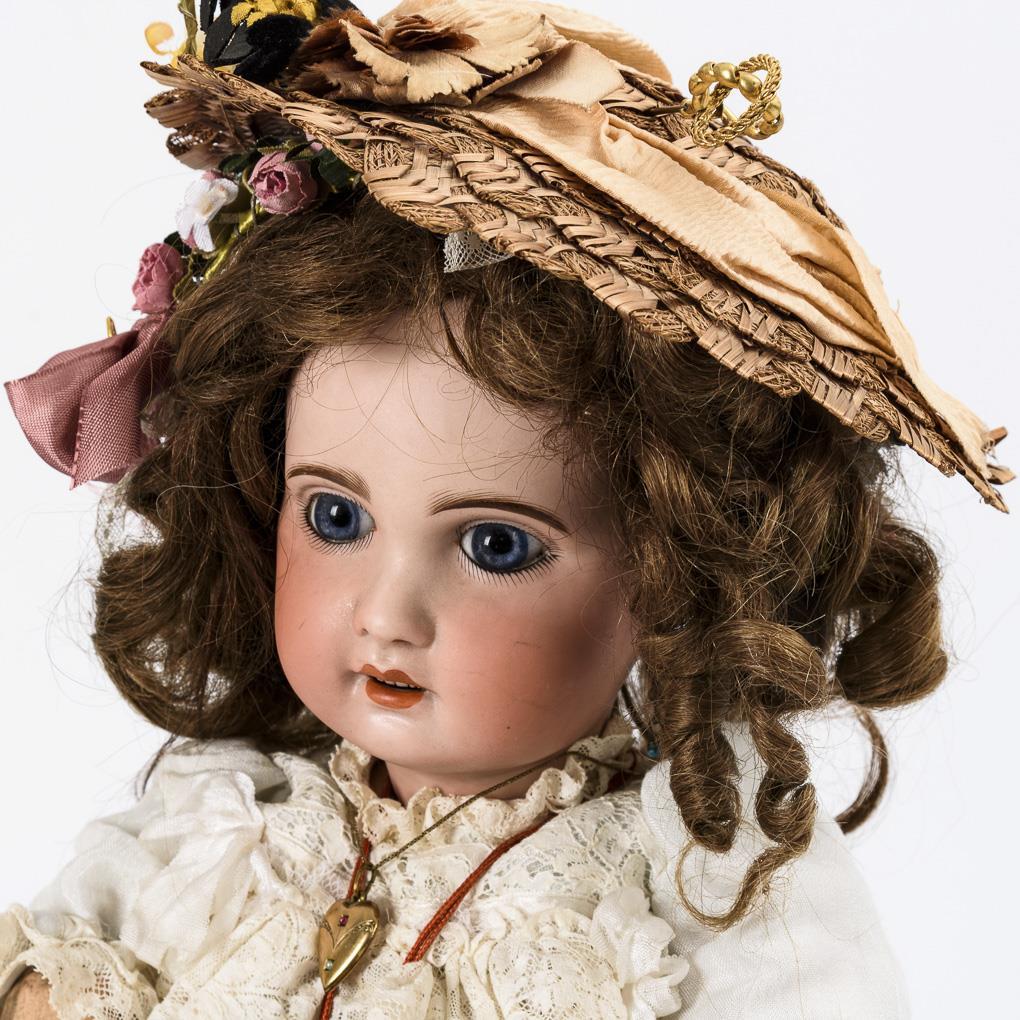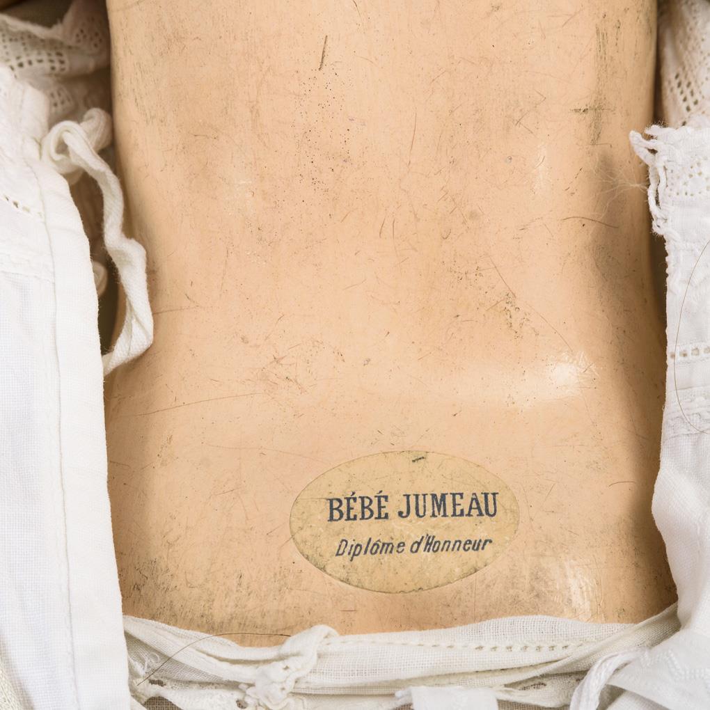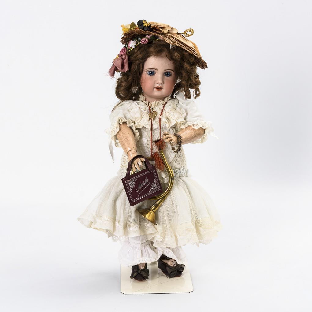 Kurbelkopf mit Korkdeckel, feste blaue Glasaugen, originale Ohrringe, braune Echthaarperücke mit Haarteil. 11-teiliger Gliederkörper mit originalem Etikett "Bébé Jumeau, Diplôme d'honneur". Weißes Kleid, Strohhut, Blumenkranz, braune Lederschuhe. Mit Horn, Musiktasche, alter Kette und Granatarmband, Ohrringen. Kopf durchleuchtet: ohne Defekte. Körper mit Farbdefekten, vor allem an Händen und Füßen.
