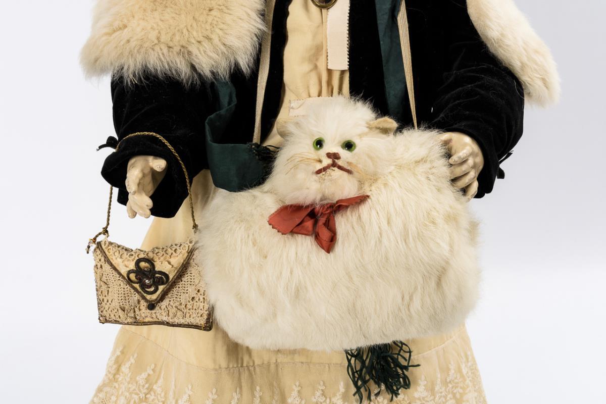 Kurbelkopf, braune Schlafaugen, Wimpern, braune Kunsthaarperücke. 15-teiliger Gliederkörper. Weißes Kleid, schwarze Samtjacke, grüne Samthaube, Fellstola, alte Kinderschuhe und schöner alter Fell-Muff mit Pappmaché-Katzenkopf. Kurbelkopf mit 2 kurzen Haarrissen an Kopfkrone und Hals. Körper partiell übermalt.