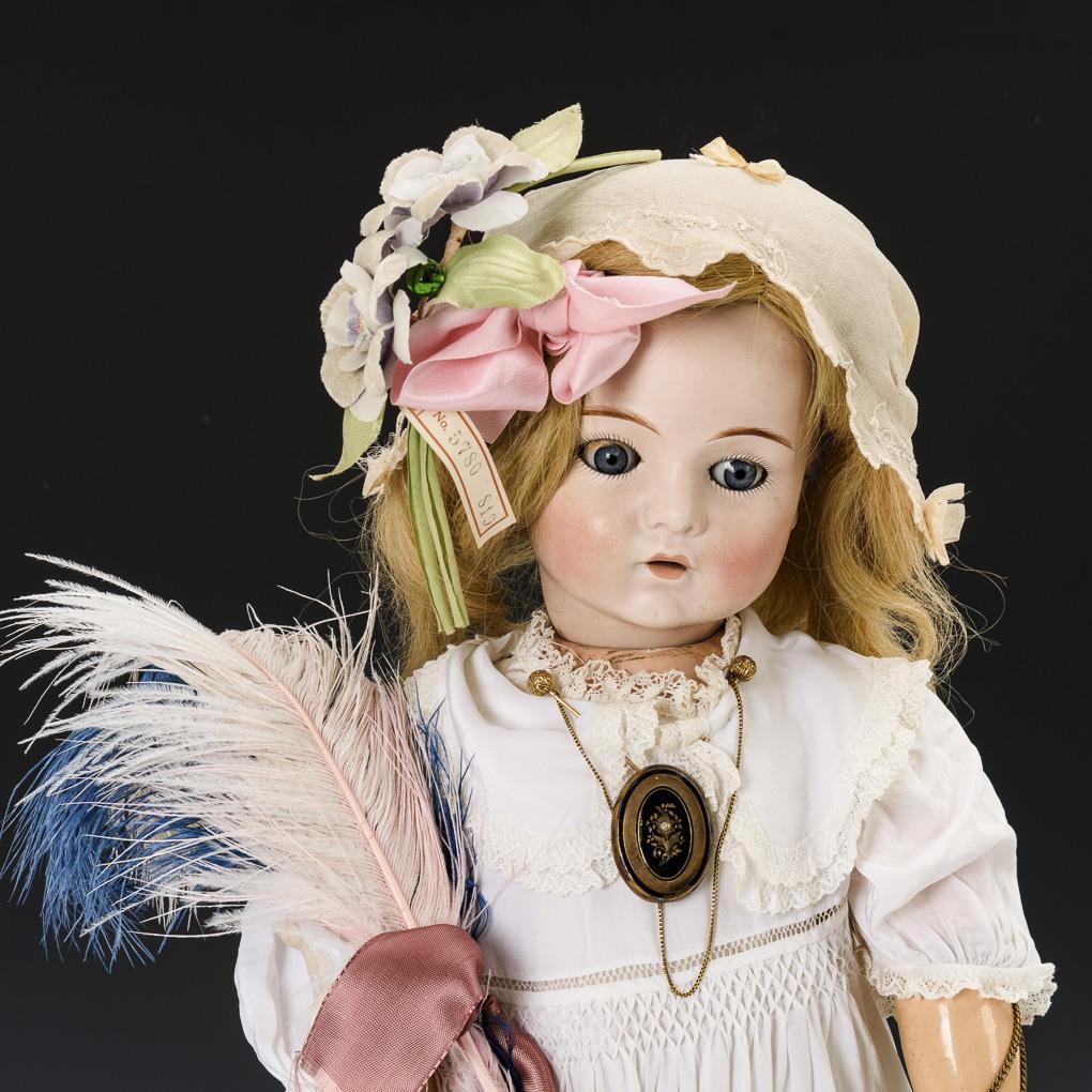 Heller Kurbelkopf, blaue Schlafaugen, blonde Echthaarperücke.15-teiliger, französisch-deutscher Gliederkörper. Weißes Kleid, helles Häubchen, grüne Lederschuhe, schwarzer Pompadour-Beutel, farbiger Federbusch. Kopf mit geklebtem Ausbruch am Hinterkopf. Körper mit Farbdefekten.