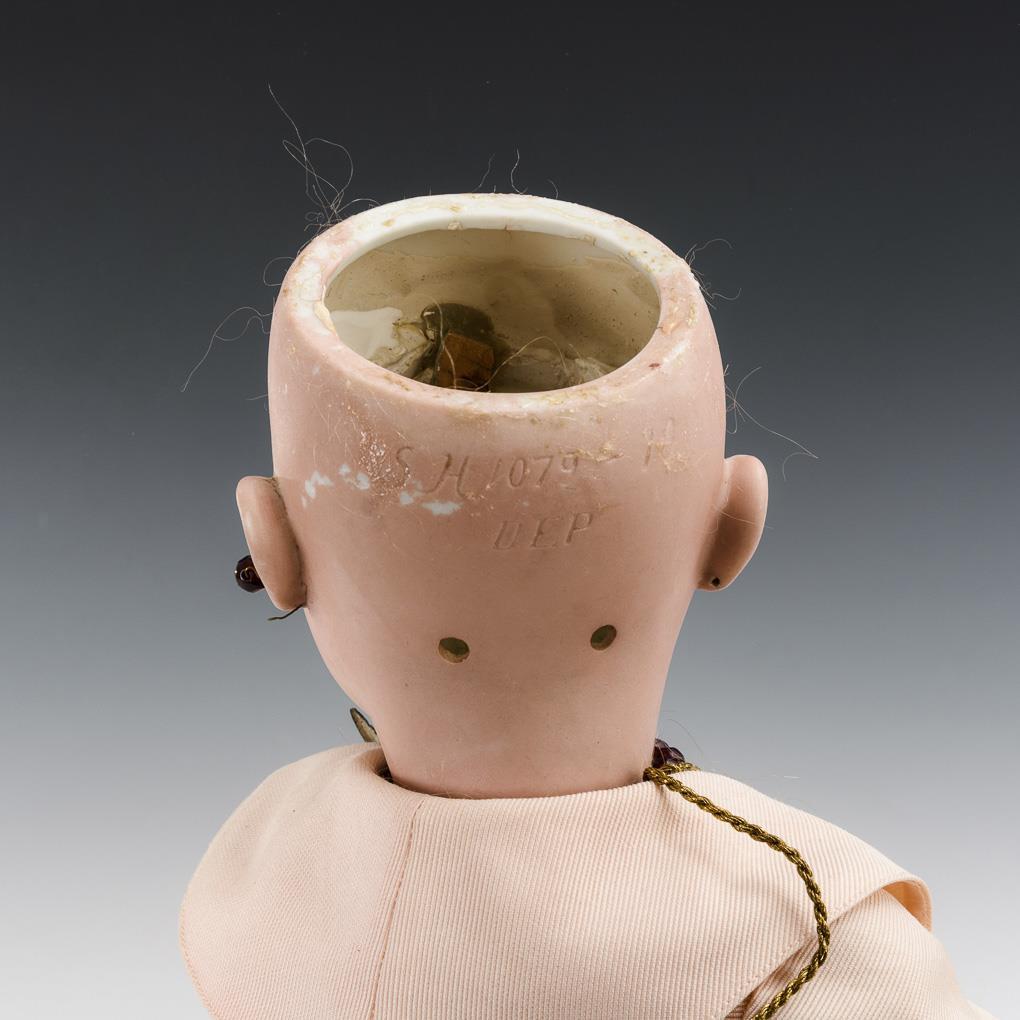 Kurbelkopf, blaue Schlafaugen, Wimpern, Ohrringe, blonde Mohairperücke. 11-teiliger Gliederkörper. Zartrosa Kostümkleid, alte braun-weiße Schuhe, Schmuck, Haube und Akkordeon. Kopf durchleuchtet: ohne Defekte, lediglich etwas Perückenpull am Hinterkopf.