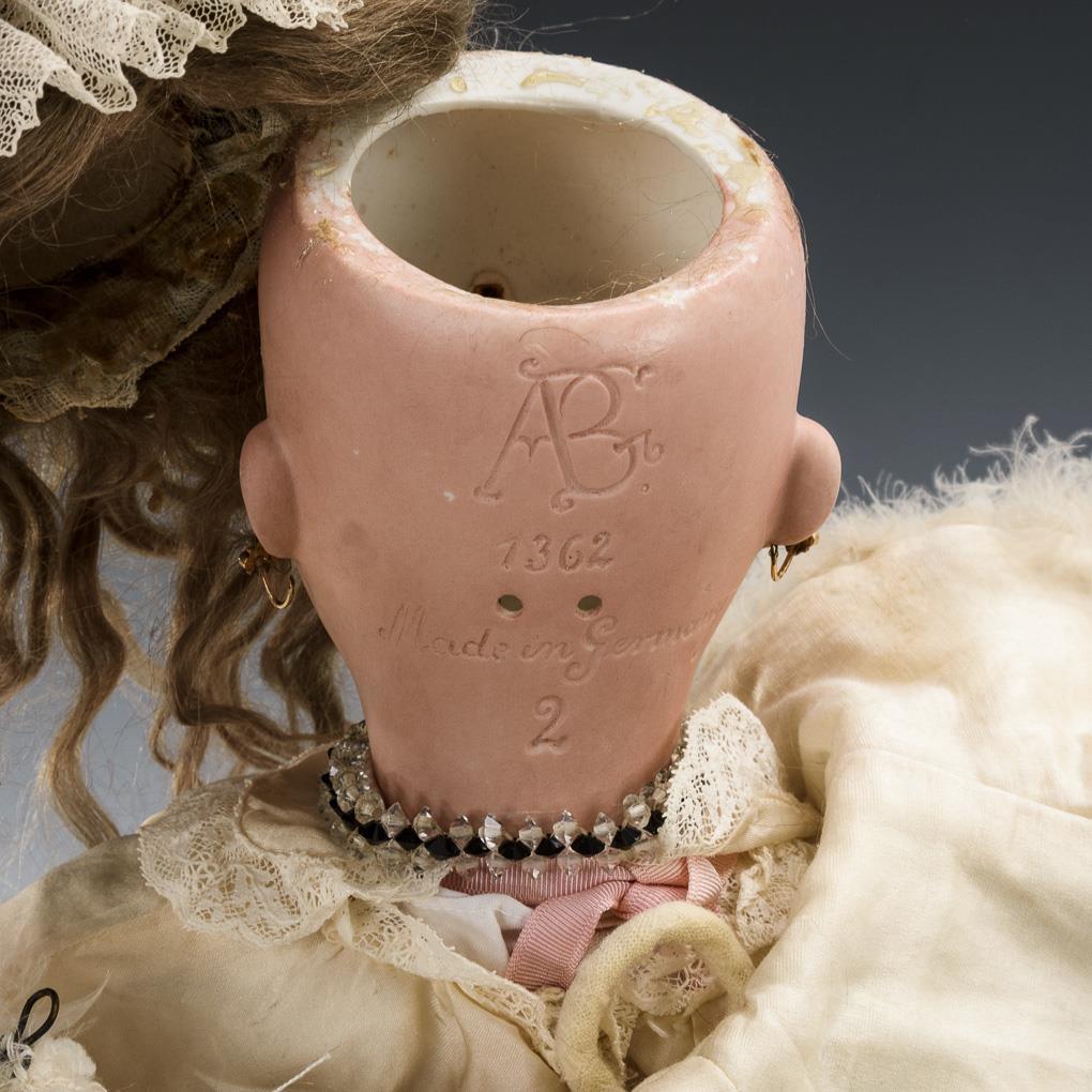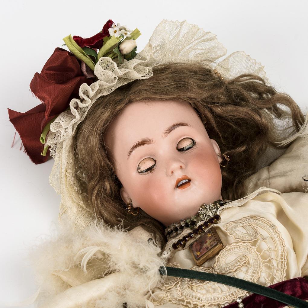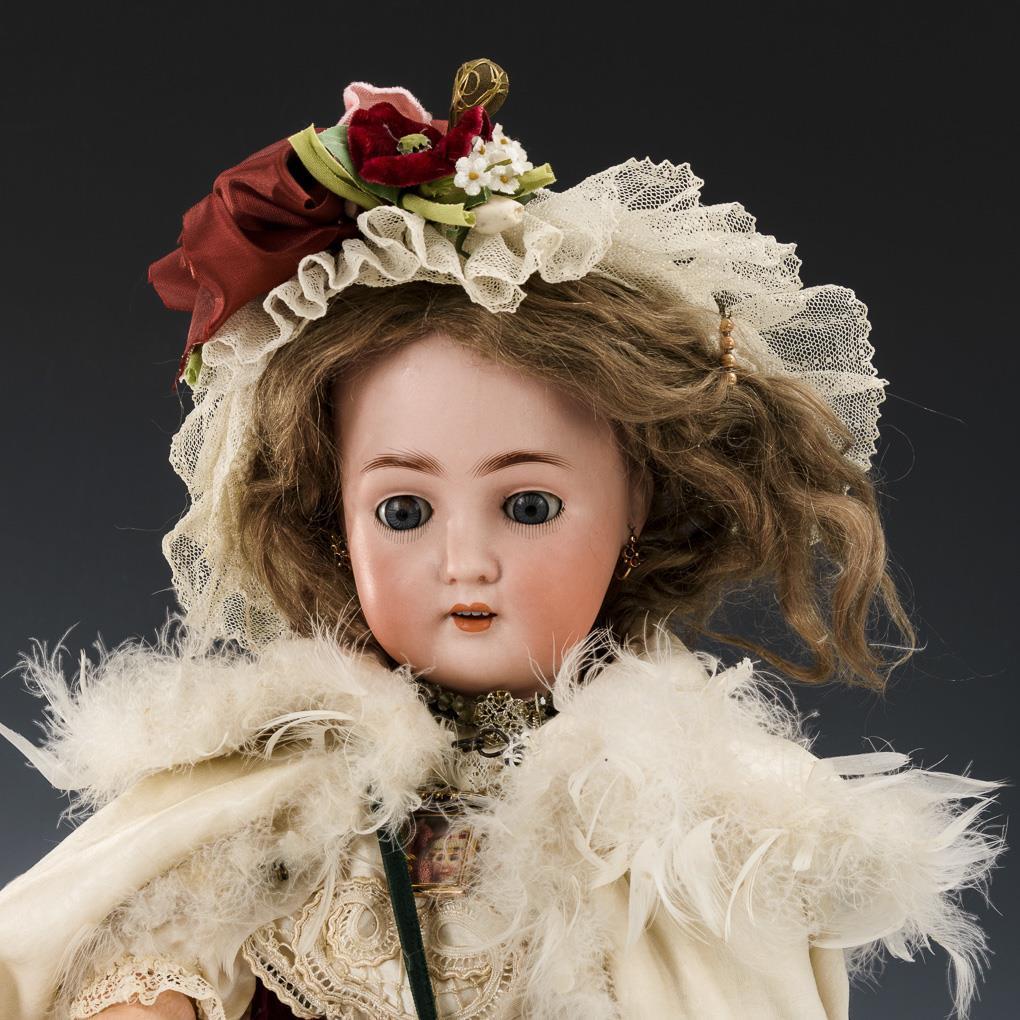 Kurbelkopf, blaue Schlafaugen, Wimpernreste, Ohrringe, mittelblonde Mohairperücke. 15-teiliger Gliederkörper. Helles Seidenkleid, weißer Mantel mit Federnbesatz, Häubchen, schwarze Wachstuchschuhe. Kopf durchleuchtet: ohne Defekte, lediglich kleiner Chip am rechten Ohrläppchen.