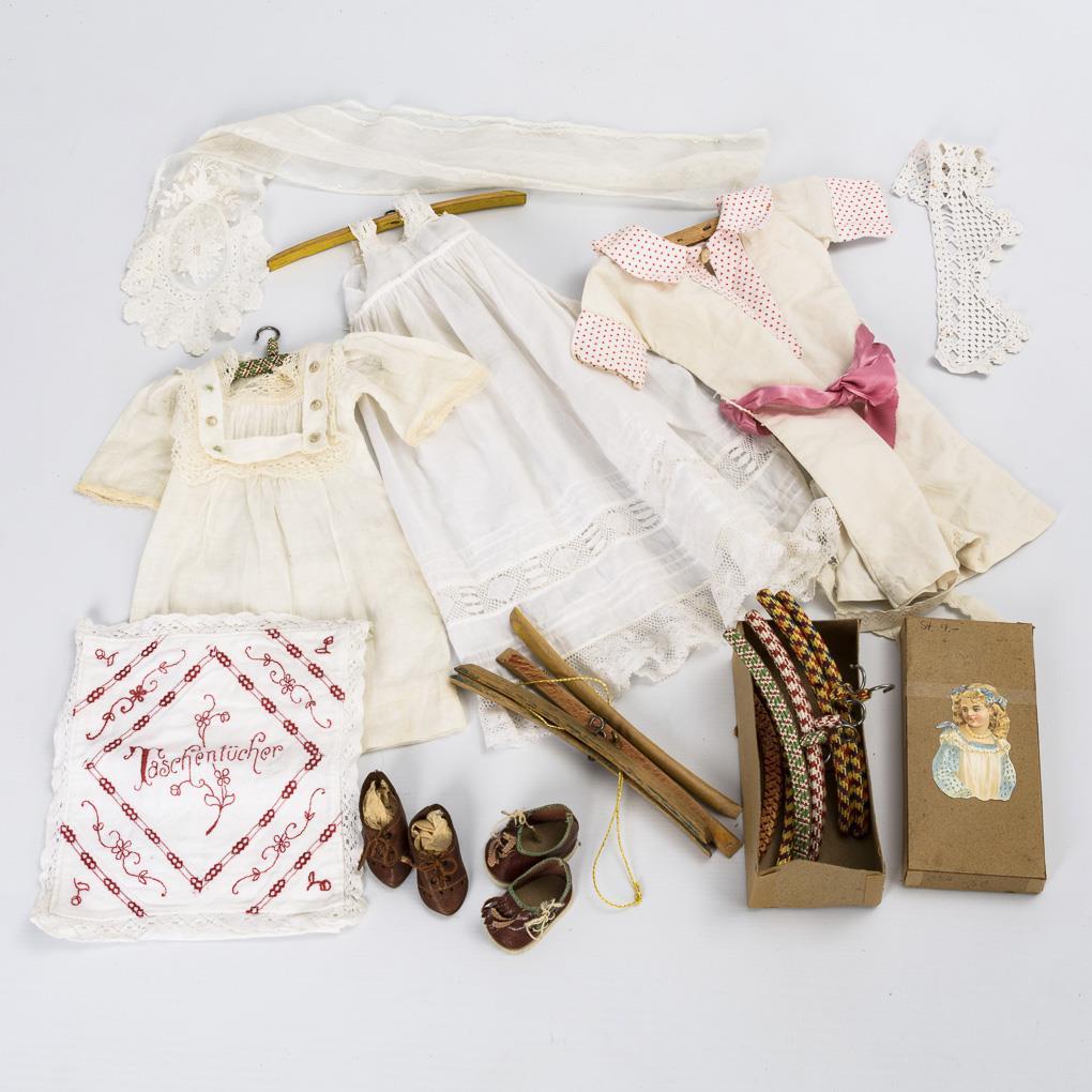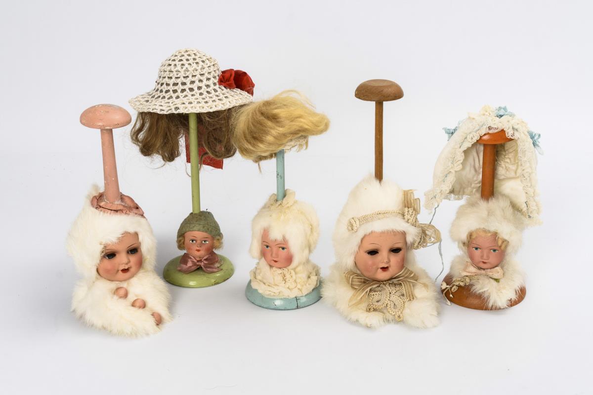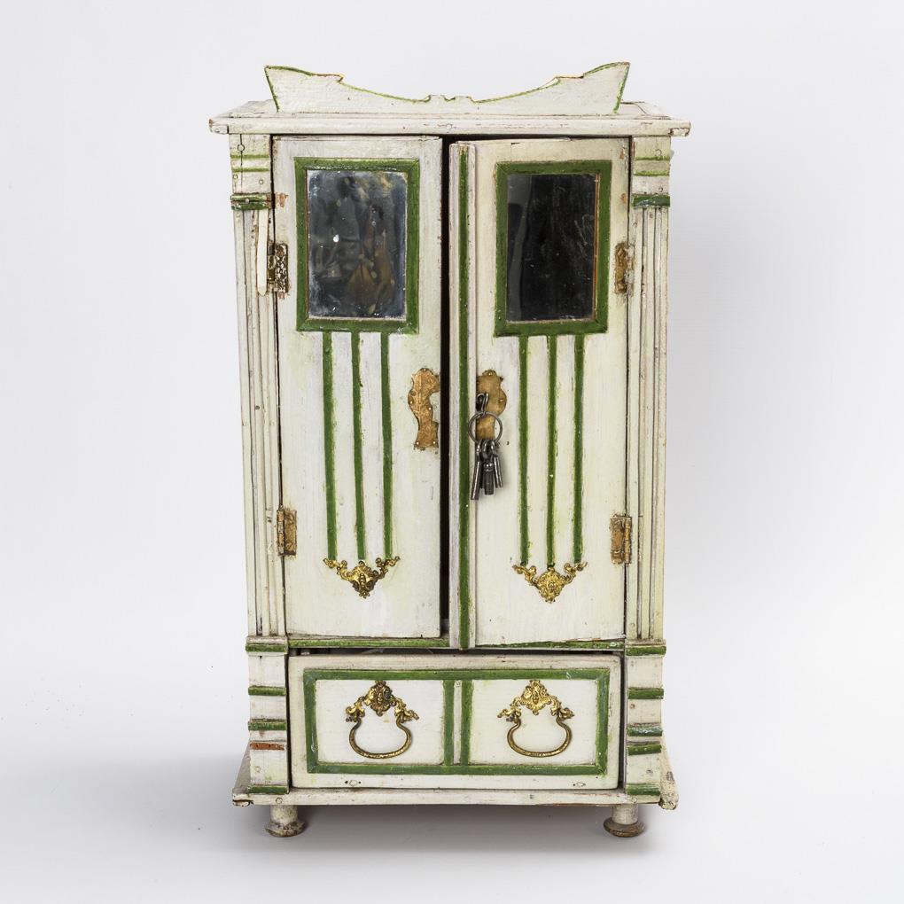 2-türiger Kleiderschrank mit 2 Spiegeln und 1 Schub. Darin 3 Kleider, 2 Paar Schuhe, mehrere Kleiderbügel und Schlüsselbund (nicht passend). Dazu 5 außergewöhnliche Hutständer mit Puppenköpfen (H 22-26 cm). Altersspuren, Tür schließt nicht.