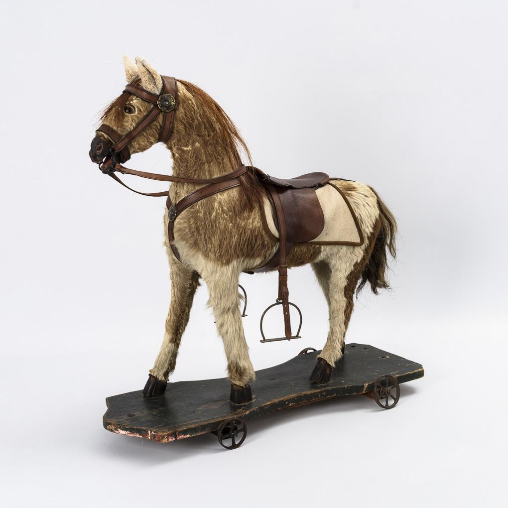Fellbezogenes Schaukelpferd auf Rädern.