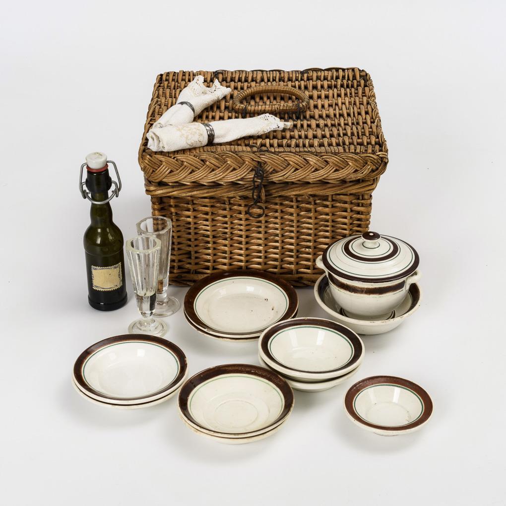 Stilvolles Picknick-Set für 2 Personen, mit Besteck, Sektgläsern, Flasche, Keramik-Terrine, 2 Schüsseln und 8 Tellern. Bespielt, kleine Bestoßungen am Geschirr.