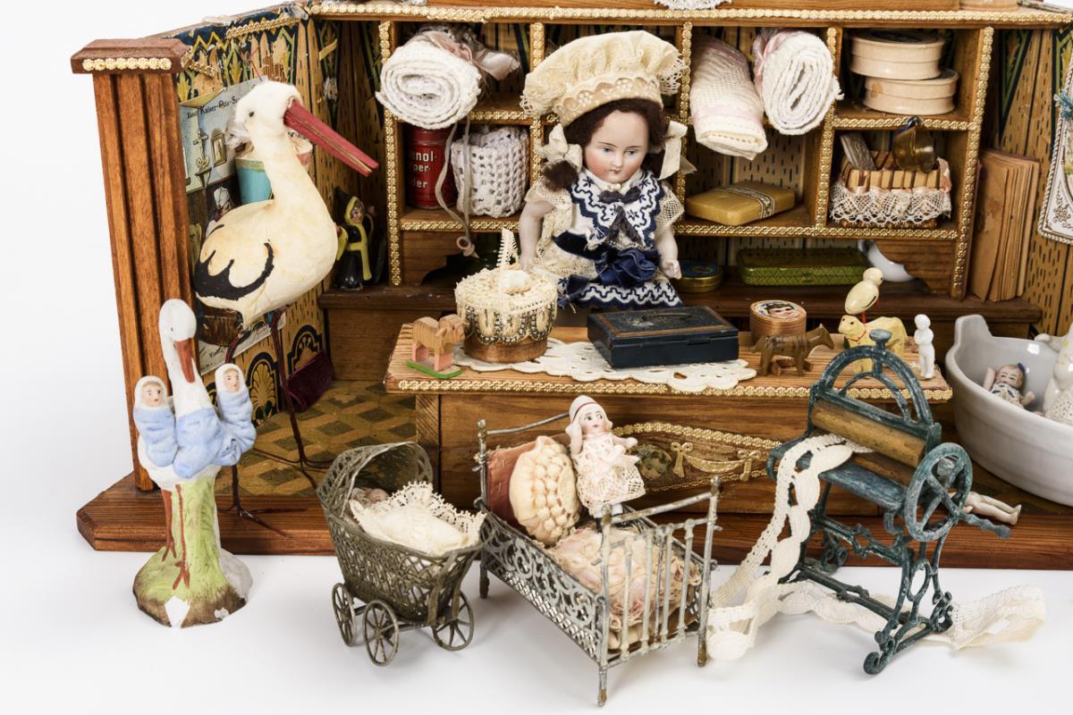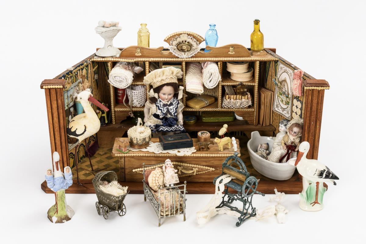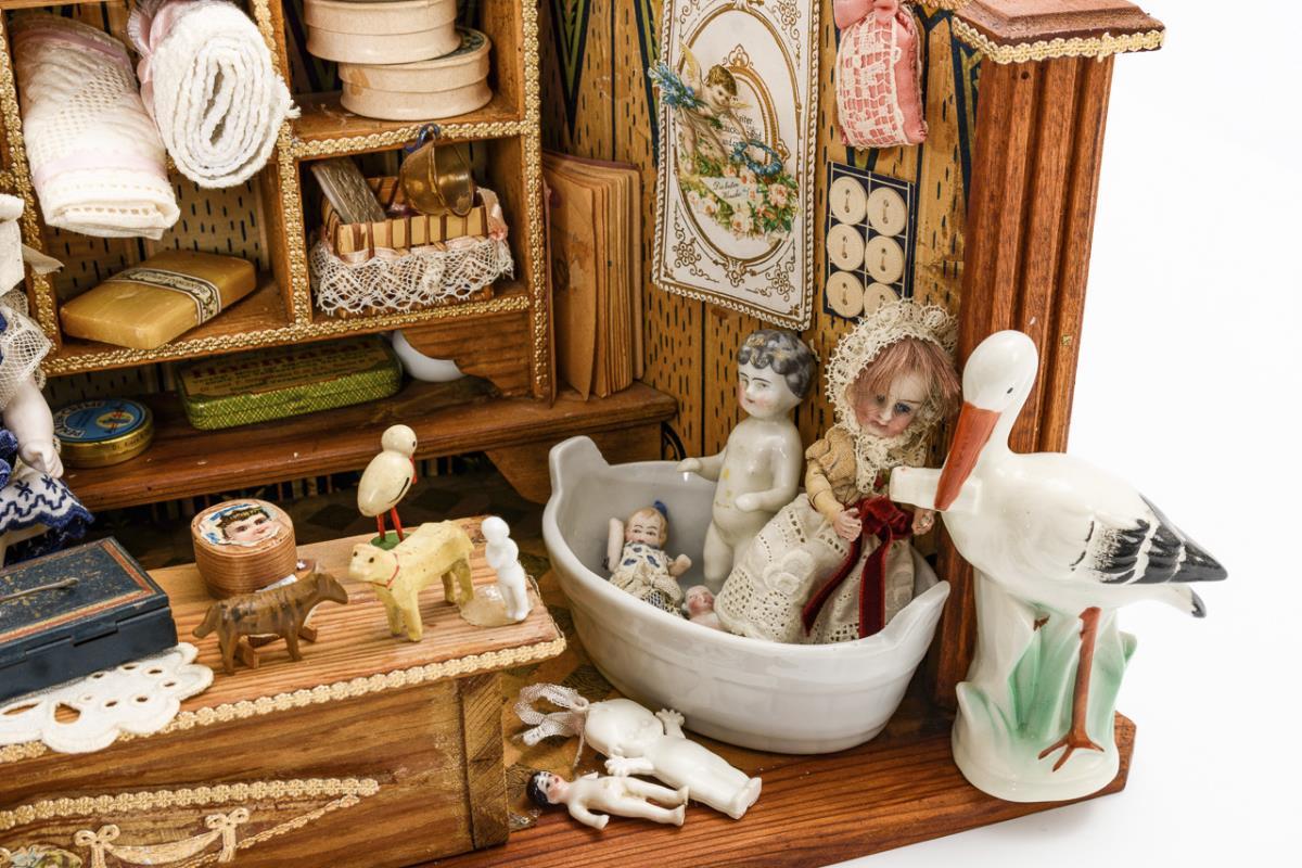 Trapezförmiges Holzgehäuse mit Regal und Theke. Liebevoll mit alten Accessoires wie Stoffen, Störchen, Bettchen, alter Wäschemangel, Badewanne etc. ausgestattet. Altersspuren, kleine Defekte.