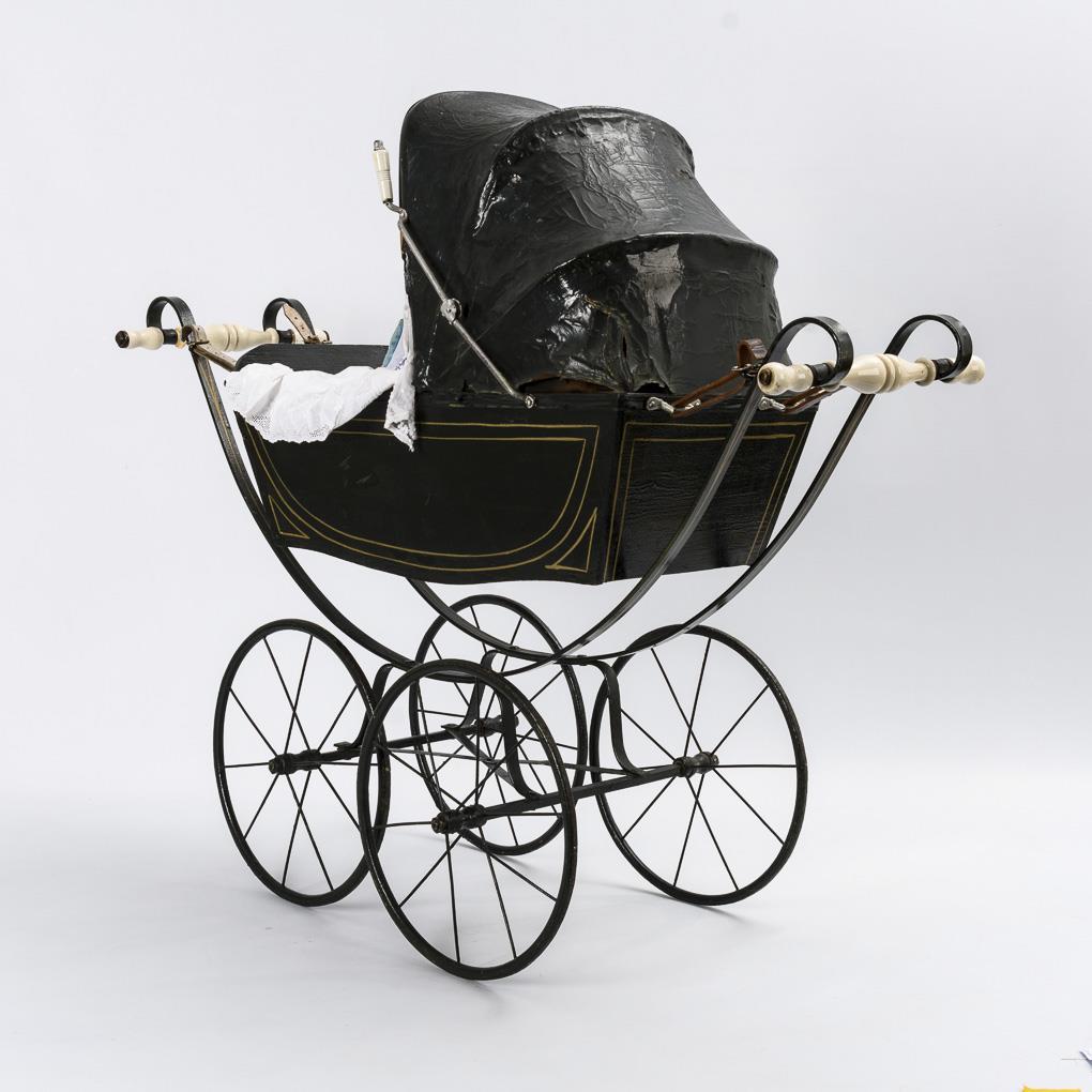 An 4 Lederriemen aufgehängte Holzwanne mit Verdeck. Auf schwarz lackiertem Eisengestell mit Speichenrädern. Altersspuren, teils etwas überarbeitet.