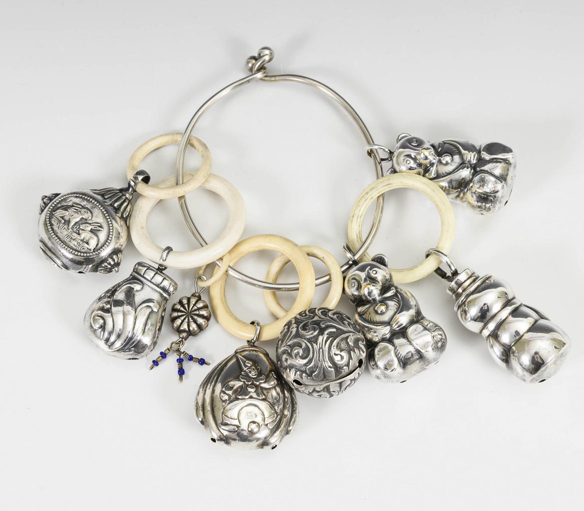 Verschiedene, teils figürliche Rasseln: 5x mit Griff, 8x mit Ring.