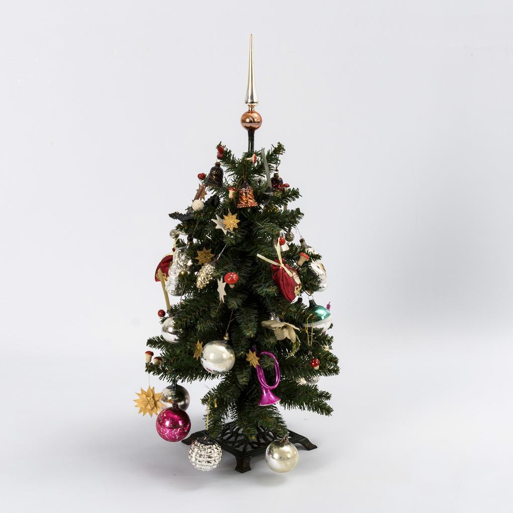 Neuzeitliches Bäumchen, reich geschmückt mit überwiegend altem Glasschmuck. Auf Ständer aus Eisenguss. Teils leichte Altersspuren.