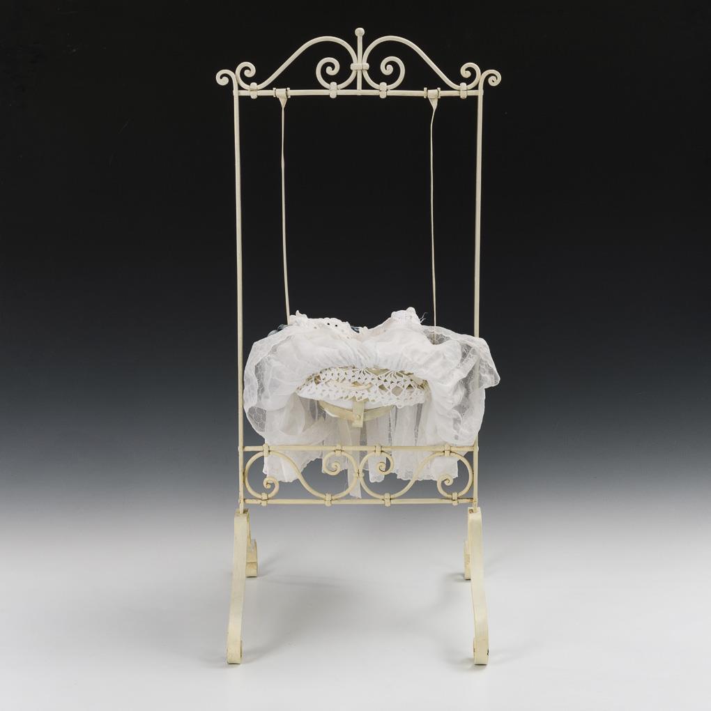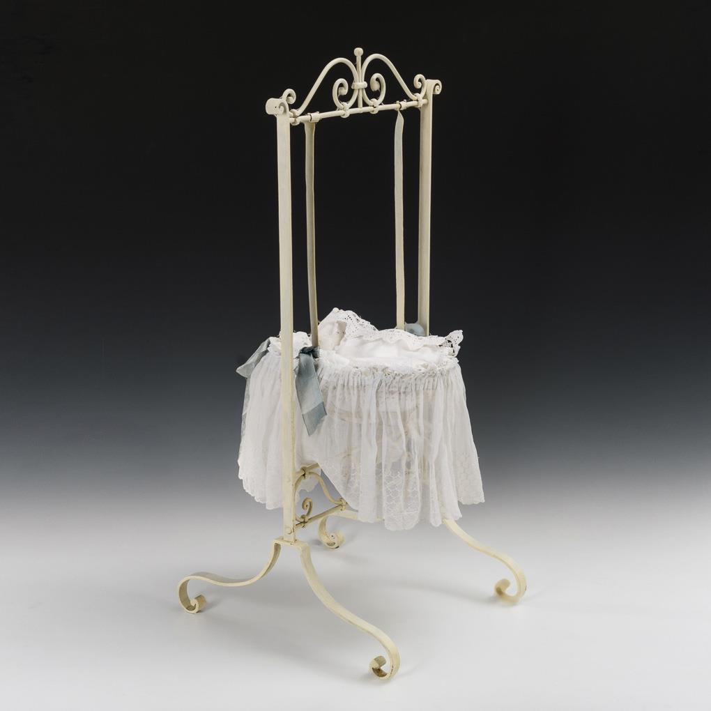 Weiß lackierte Eisenschaukel mit ovalem Körbchen, als Wiege mit weißer Wäscheausstattung.