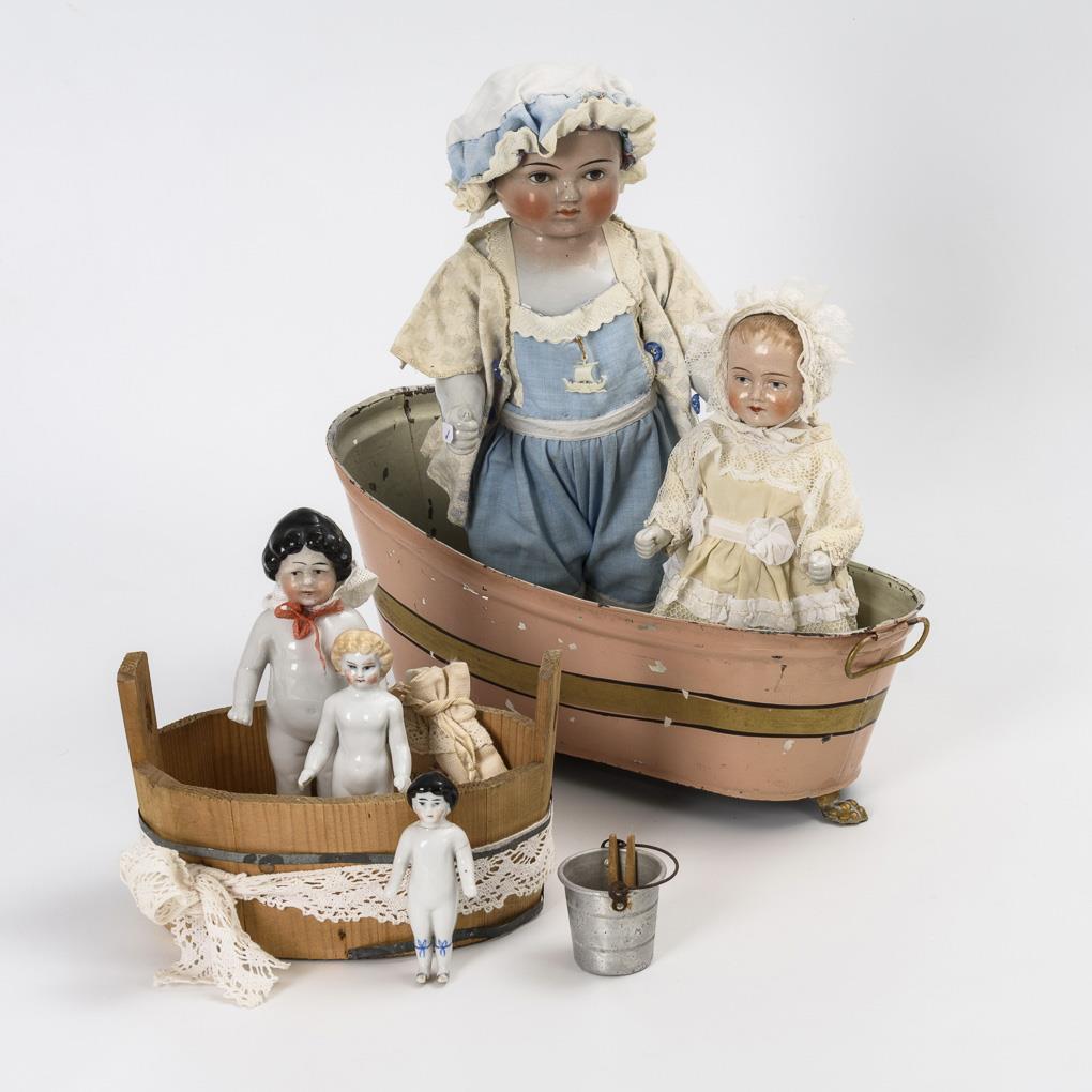 Badepüppchen in verschiedenen Größen von 9 bis 32 cm, 2x bekleidet. Dazu rosa lackierte Badewanne mit Löwenfüßen, Waschzuber und Blecheimer. Wanne mit Lackdefekten, 1 Püppchen geklebt.