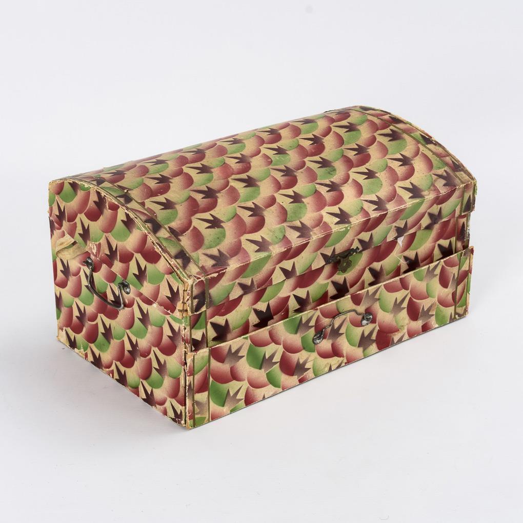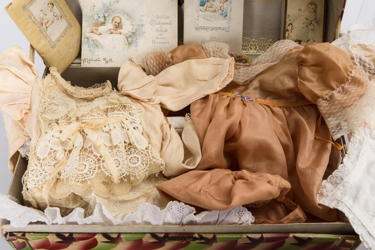 3 Puppenkleider, 4 Teile Babypuppenkleidung, 4 Häubchen, 4 paar kleine, jüngere Puppenschuhe, Lätzchen, Taufbriefe etc. In Papptruhe mit farbigem Spritzdekor. Altersspuren, Truhe mit Defekten.