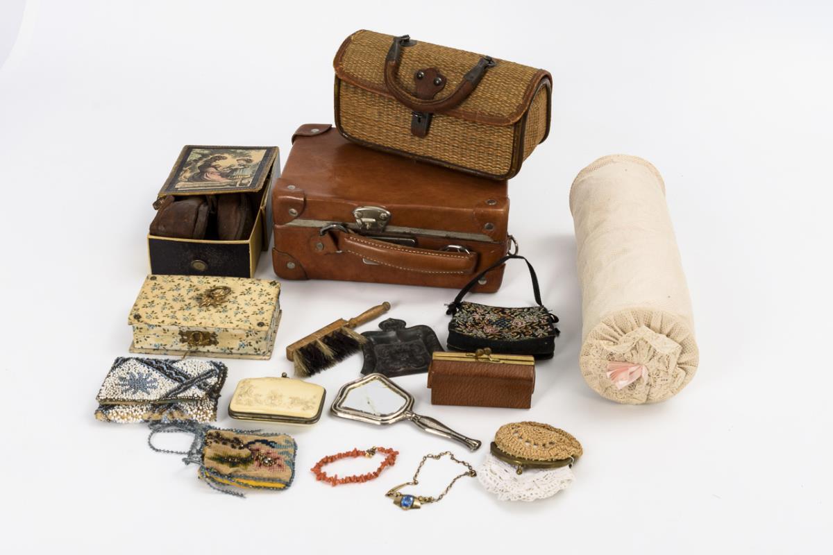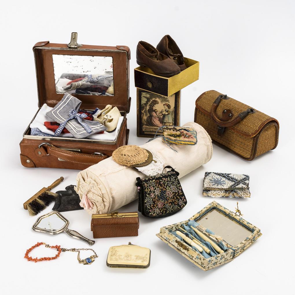 Brauner Kinderkoffer mit ca. 7 Teilen Puppenkleidung, 6 Täschchen, Hebammenkoffer aus feinem Korbgeflecht, Paar alte Kinderschuhe, Nackenrolle, Spiegel und Nähutensilien. Teils mit Altersspuren, Spiegel mit Blindstellen.