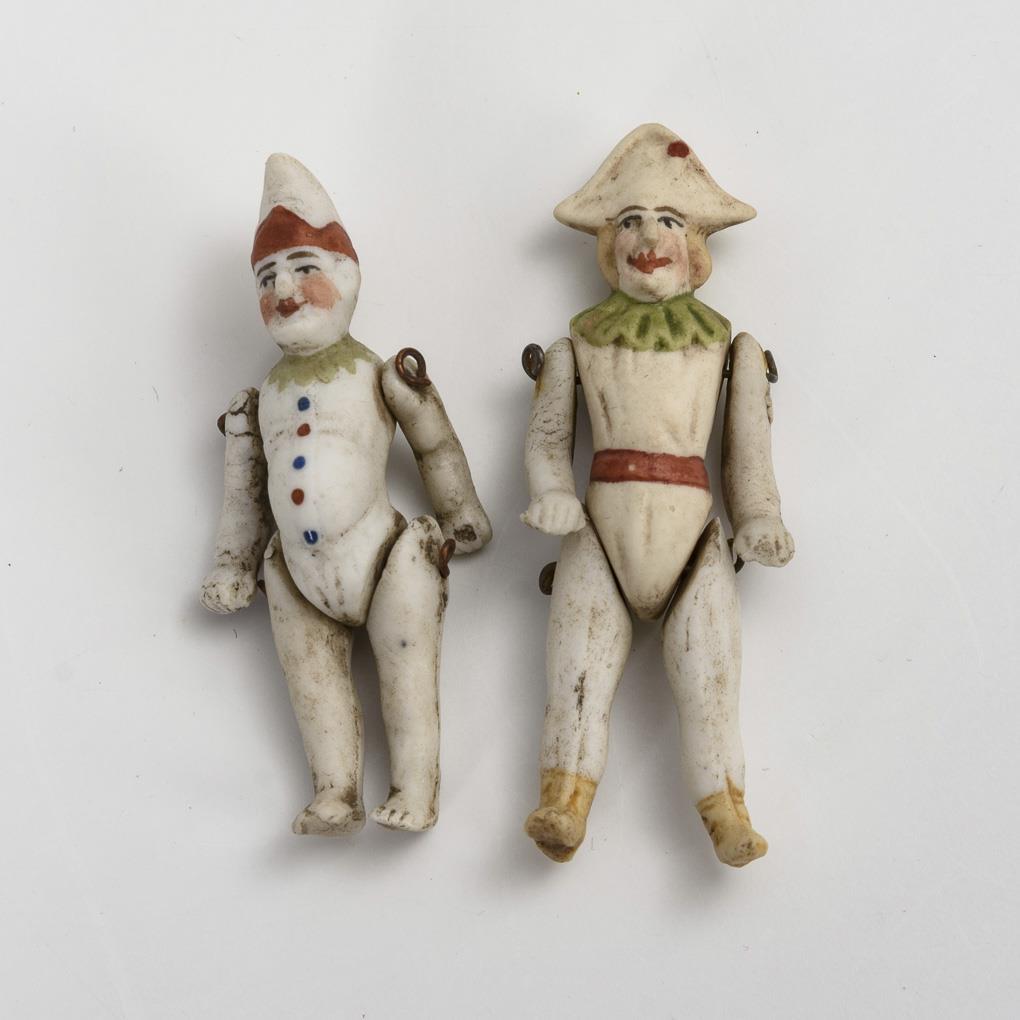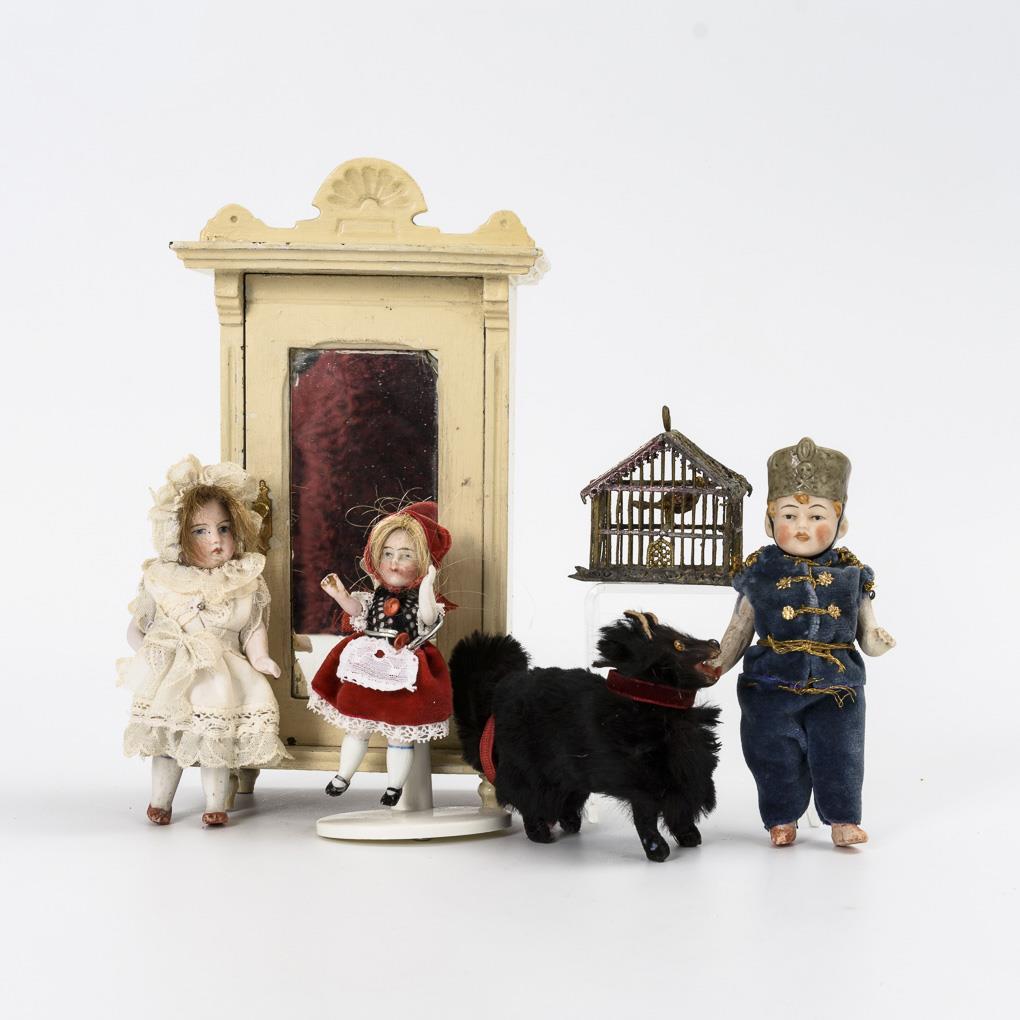 Weiß gestrichener Kleiderschrank mit Spiegeltür (H 22,5 cm), 5 Ganzbiskuitpüppchen (darunter Rotkäppchen, 2 Kasperfiguren und Bergmann), Vogelkäfig, schwarzer Spitz mit Echtfell und 5 Teile Glas. Altersspuren, kleine Defekte.