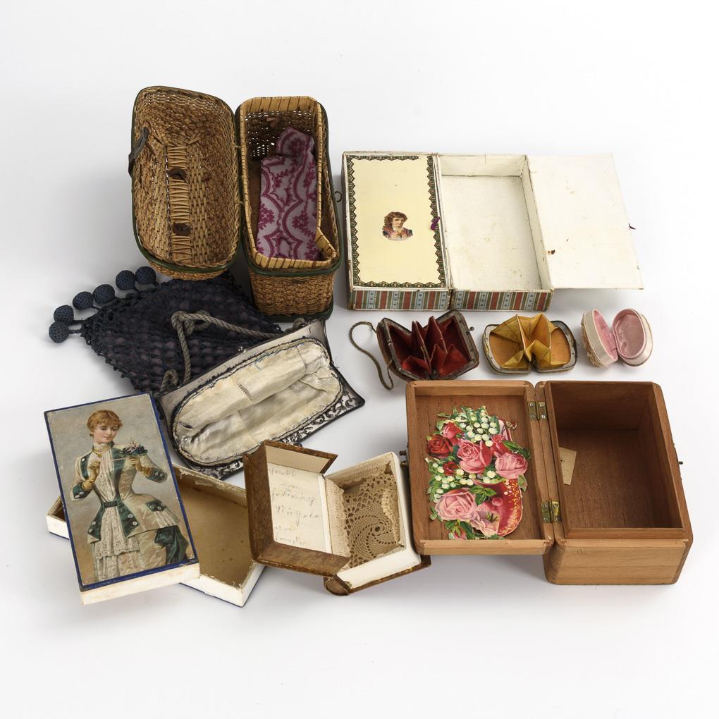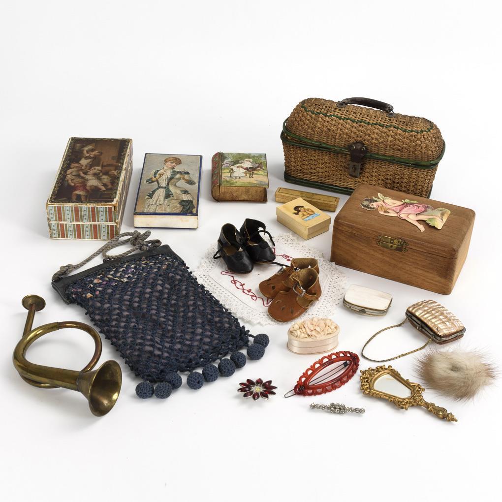 Flechtkoffer, Häkeltasche, Trompete, 3 Pappschachteln, Holzkästchen sowie einiges Zubehör wie Geldbörsen, Schuhe, Spiegel etc.