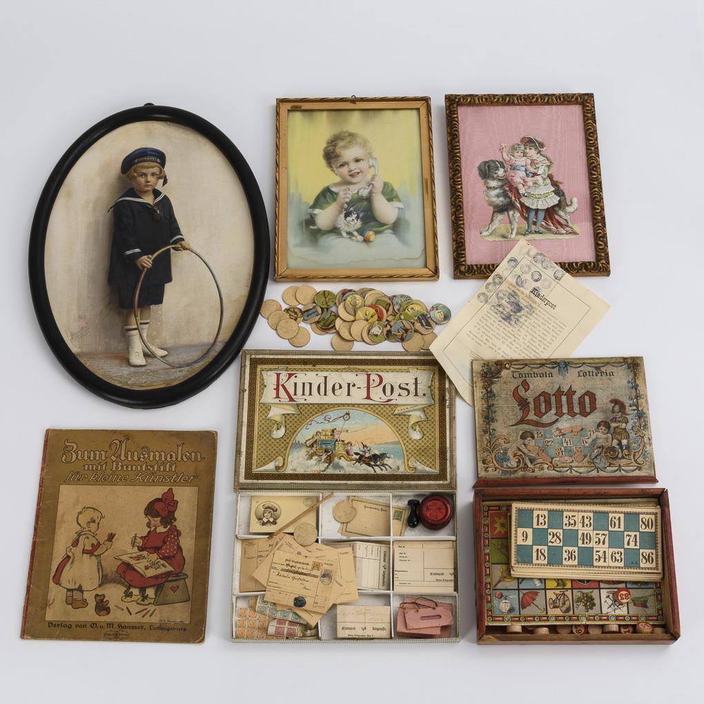 2 alte Spiele in Originalkartons, Malbuch "für kleine Künstler", Verlag von O. u. M. Hausser, Ludwigsburg, goldgerahmtes Bild mit Kleinkind und Telefon (27,5 x 21 cm), ovales Bild mit Kind in Matrosenanzug von 1925 (44 x 31 cm).