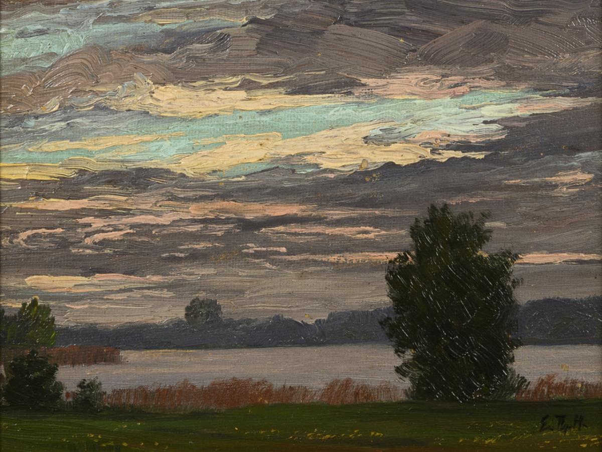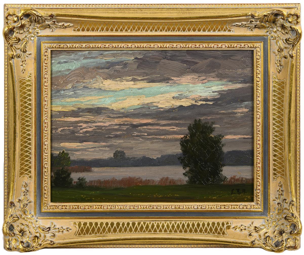 Bäume und Schilf am Ufer unter wolkigem Himmel. Wenige Farbabsplitterungen.