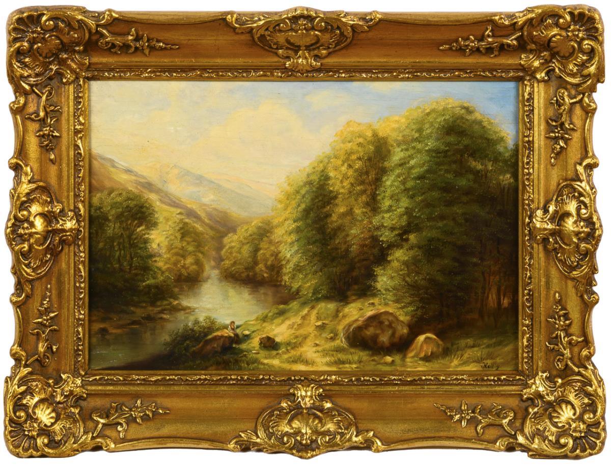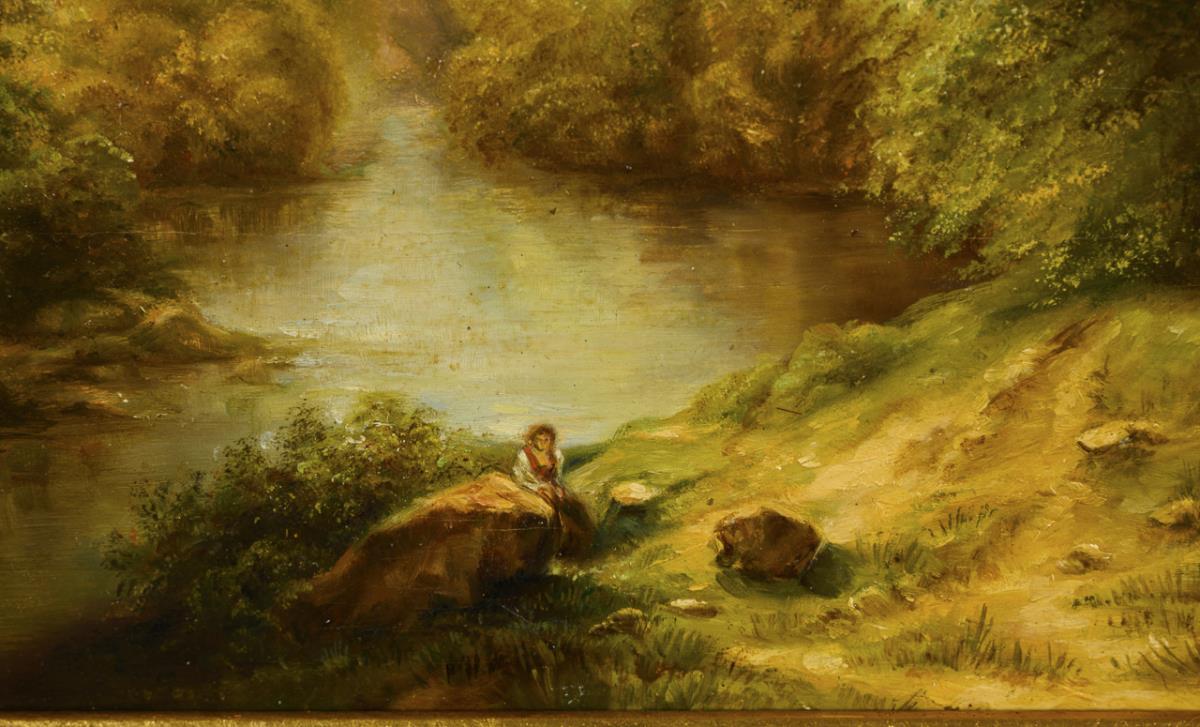 Idyllisches Sonnenlicht über dem dichten Wald mit Flusslauf und Staffagefigur.