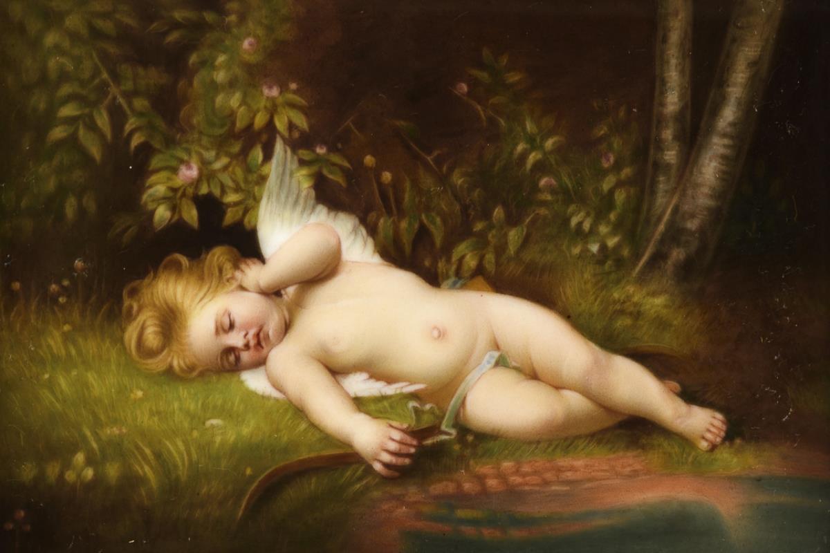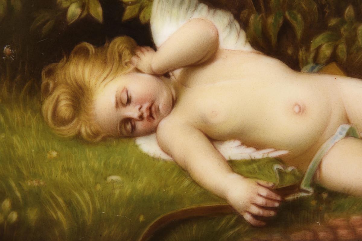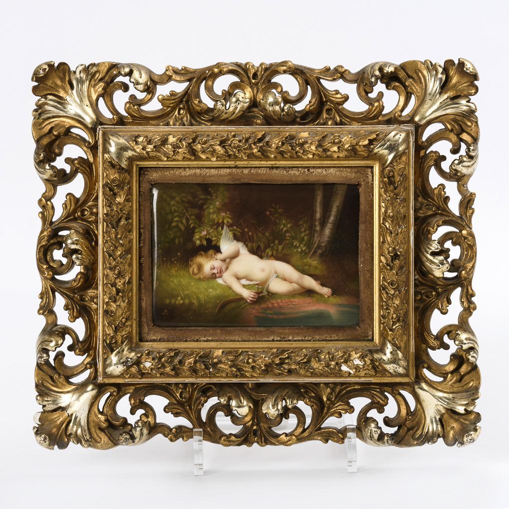 Rechteckige Bildplatte mit der Darstellung des am Ufer eines Gewässers liegenden, schlafenden Amorknaben. Rahmen mit Klebestelle und Bestoßung.