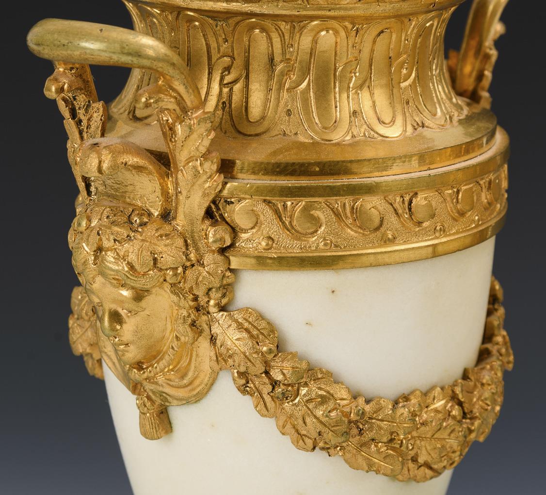 Vasenförmige Beisteller in antikisierender Form mit reicher Reliefzier und Bacchantinnen-Maskaronen. Minimale Chips an der Sockelplinthe.