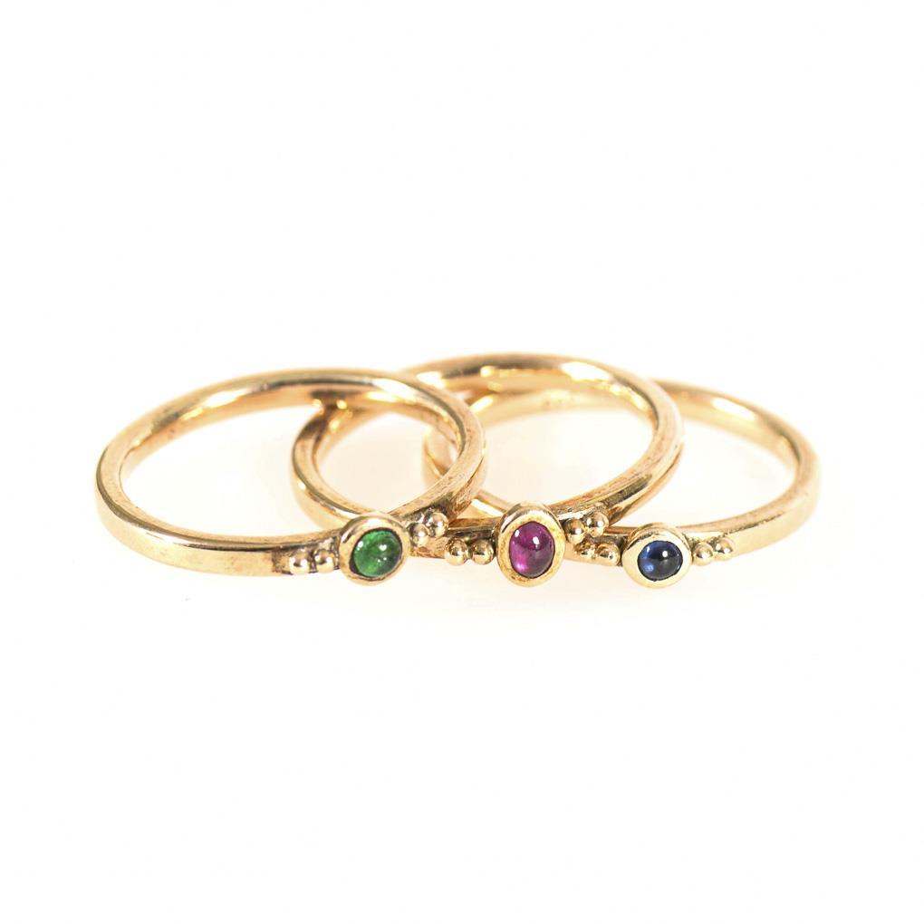 Schmale Reifen mit Saphir-, Rubin- und Smaragdcabochon und kleinen Granalien.