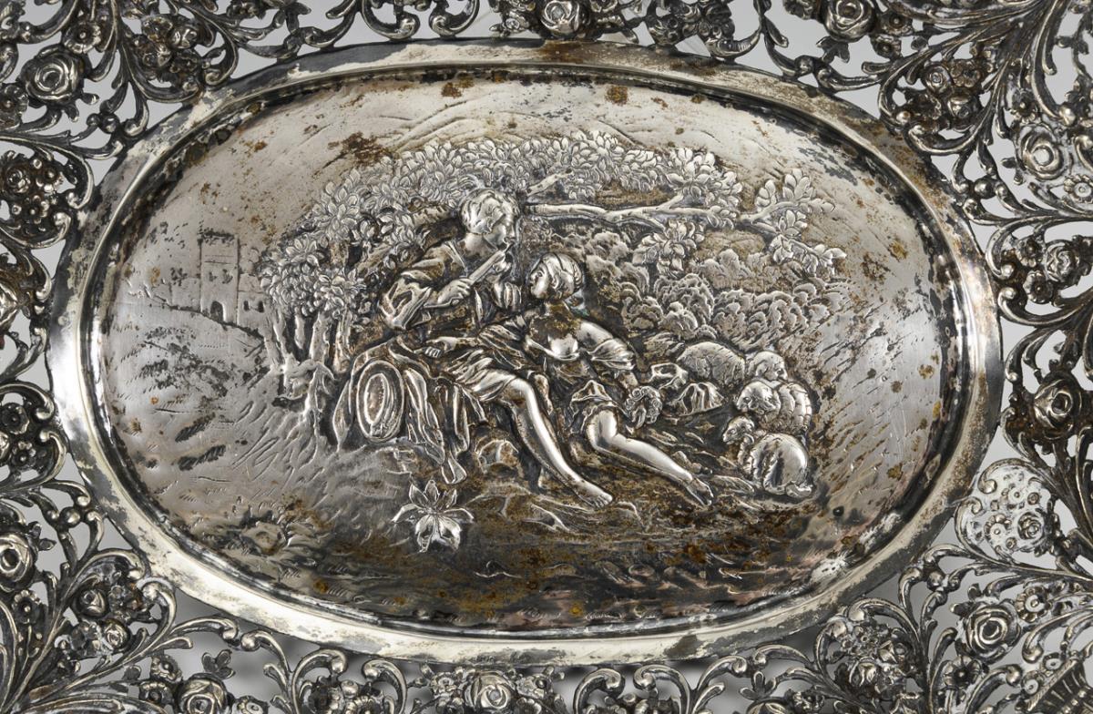 Reliefierte Silberschale mit Liebespaar im Spiegel. Am Rand Blütenkörbe, Putten und 4 ungravierte Medaillons. Unterseitige Widmungsgravur "Ostern 1930". Gebrauchsspuren.