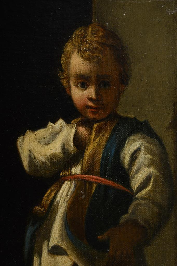 Der Junge in weißem Hemd mit blau-goldener Weste an einer Mauer im Sonnenschein. Altersspuren.