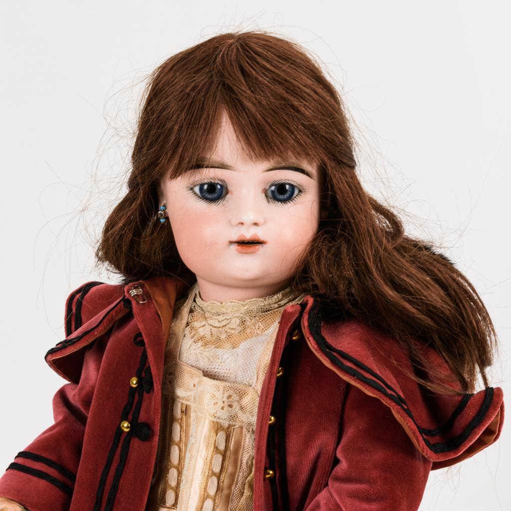 Kurbelkopf, feste blaue Paperweightaugen, offener Mund, Zahnreihe, Ohrringe, lange braune Echthaarperücke. 9-teiliger Gliederkörper. Rosa Seidenkleid, weinroter Samtmantel mit Fellkapuze. Kopf mit Haarrissen (teils geklebt), Körper mit kleinen Farbdefekten.