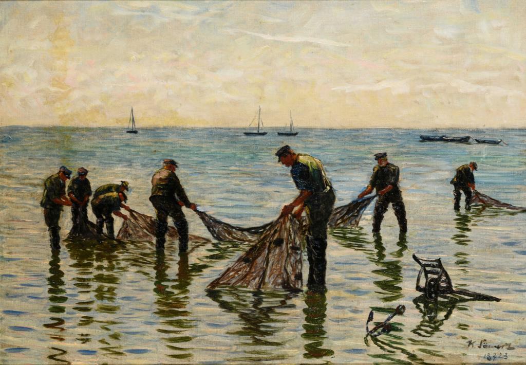 Die Fischer beim Einholen der Netze im seichten Meerwasser. Restauriert.