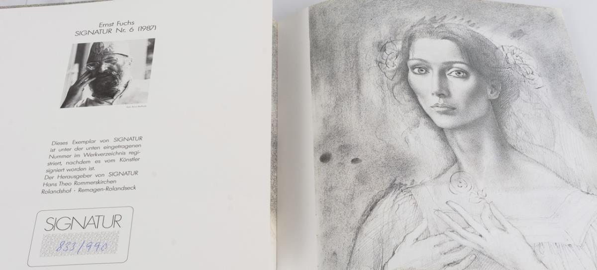 3 gebundene Werke mit handsigniertem Titelblatt. Je ein vollständiges Gesamtkunstwerk eines Künstlers in 3 von 40 Bänden; herausgegeben von Hans Theo Rommerskirchen: Ernst Fuchs "Signatur. Zeit - Schrift - Bild - Objekt Nr. 6", 1987, Exemplar: 883/990 | Peter Rühmkorf "Signatur. Zeit - Schrift - Bild - Objekt Nr. 24", 1996, Exemplar: 819/990 und Erica Pedretti "Signatur. Zeit - Schrift - Bild - Objekt Nr. 35", 2001, Exemplar: 766/990, inklusive CD.