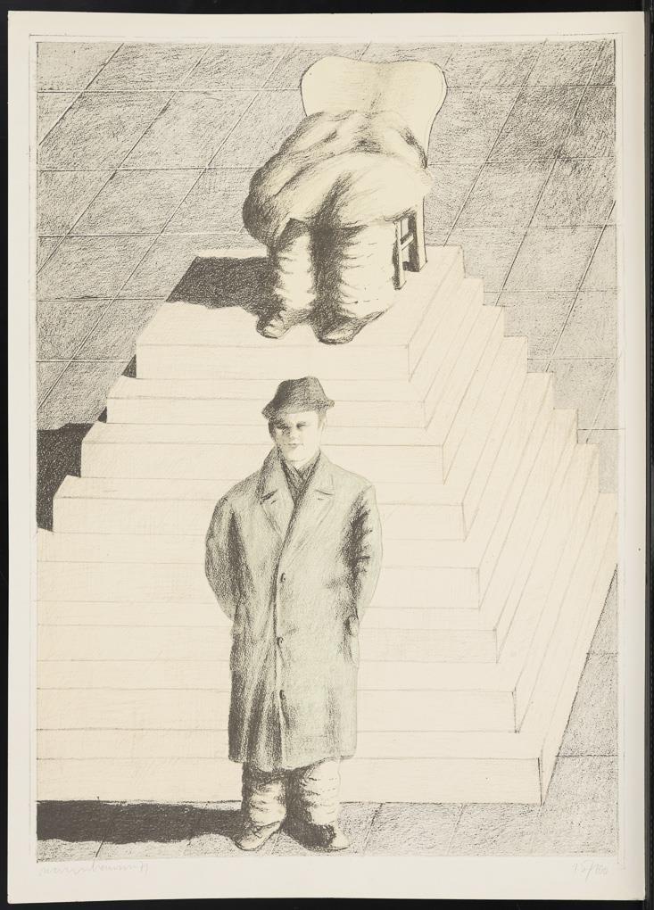 "Neun Busenfrauen", Blatt: 57 x 46 cm, Exemplar: 56/100, [19]66, Randbereich etwas knickspurig | "Mann vor Treppe", Blatt: 70 x 50 cm, Exemplar: 15/100, [19]71, Randbereich etwas griff- und knickspurig.