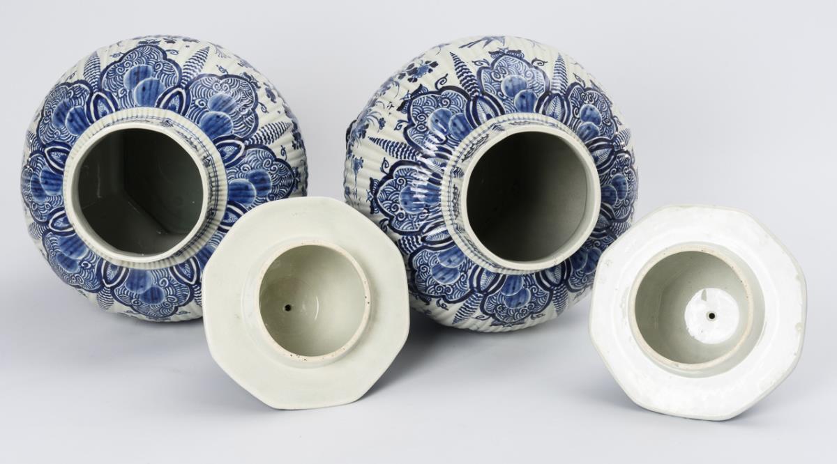 Paar sehr große Delfter Fayence-Deckelvasen mit exotischen Blumen und Vögeln. De Porceleyne Fles, Joost Thooft.