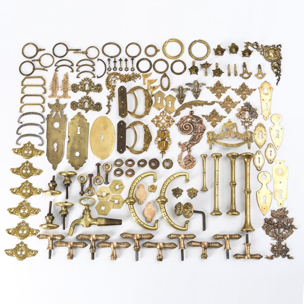 Zahlreiche Möbelbeschläge, Fensterwirbel, Mörserstößel, Türknäufe und 1 Wasserhahn in 2 alten, frontfurnierten Sekretär-Kabinettschüben. Teils Alters-/Gebrauchsspuren, 1x angebrochen, teils Nachgüsse.