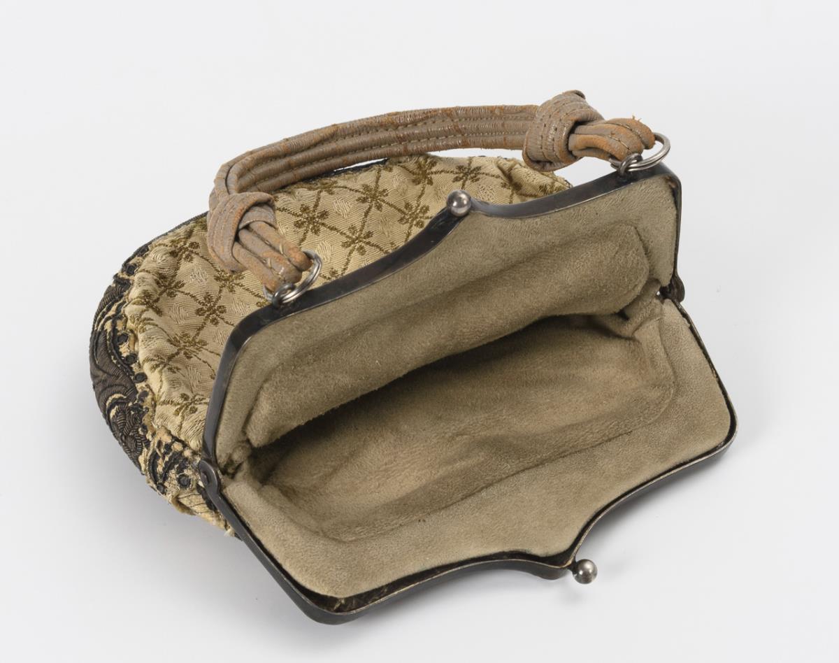 Theatertasche mit Silberbügel und Silberbrokat.