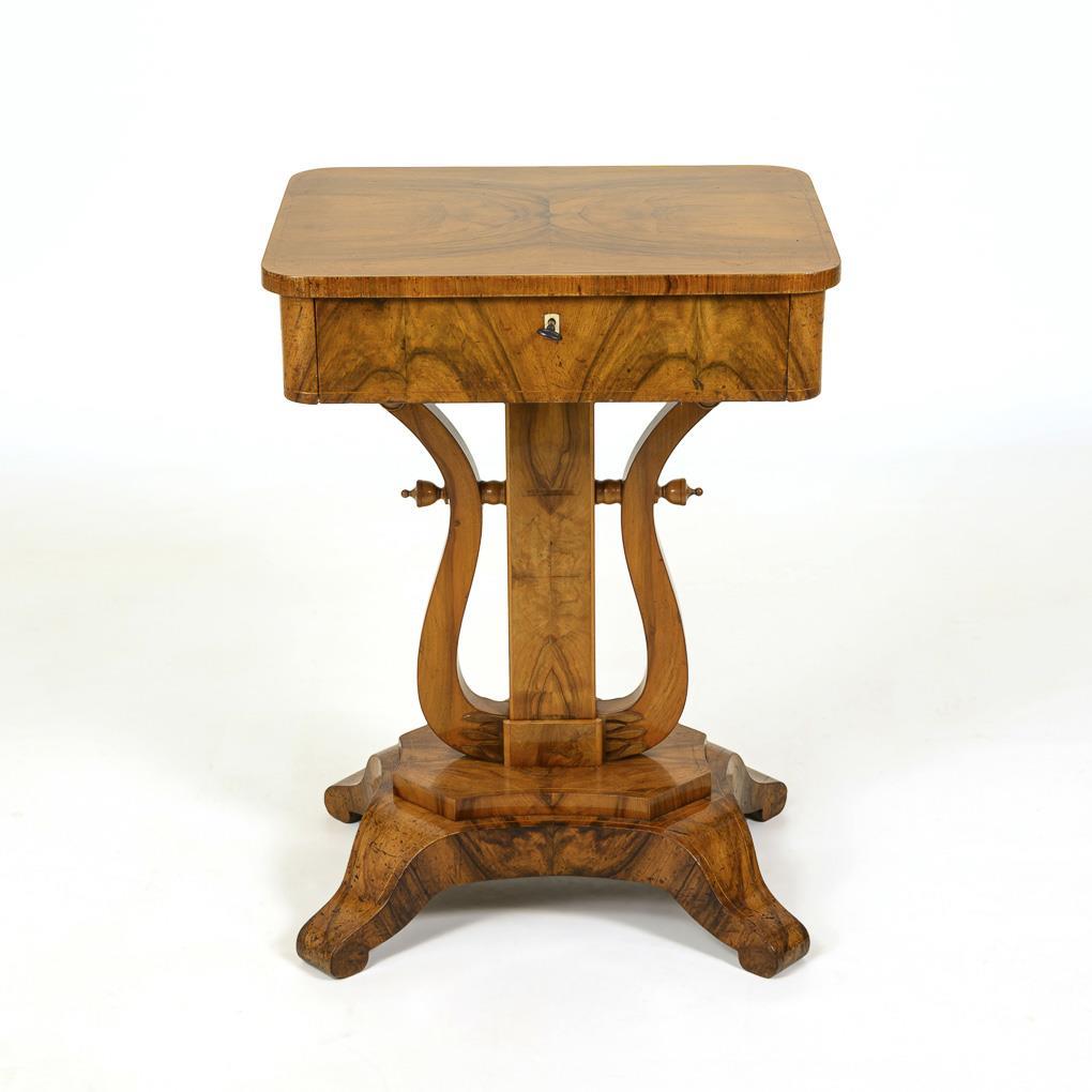 Eleganter Nähtisch mit Stütze in Form einer Lyra, verziert mit gespiegeltem Maserfurnier; verschließbarer Schub innen mit geteilten Fächern für Utensilien. Leichte Alters-/Gebrauchsspuren, restauriert.