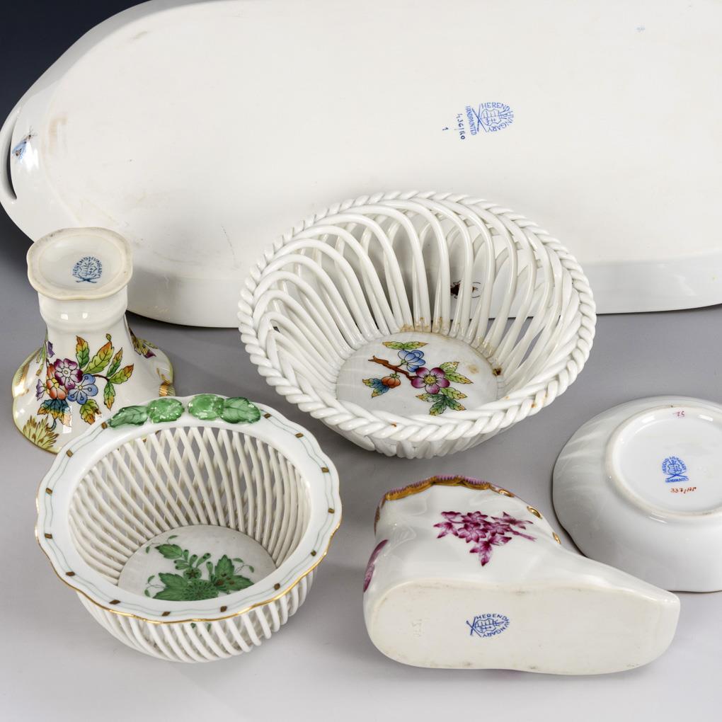 Ovales Tablett mit Rothschild-Dekor (L 36 cm), Vase (H 7 cm) und Flechtkorb (Ø 13 cm) mit polychromem indianischen Blumendekor, Schälchen (Ø 9,5 cm) und Zierschuh (L 10,5 cm) mit purpurfarbener indianischer Blumenmalerei und Flechtkorb mit grüner indianischer Blumenmalerei (Ø 10 cm).