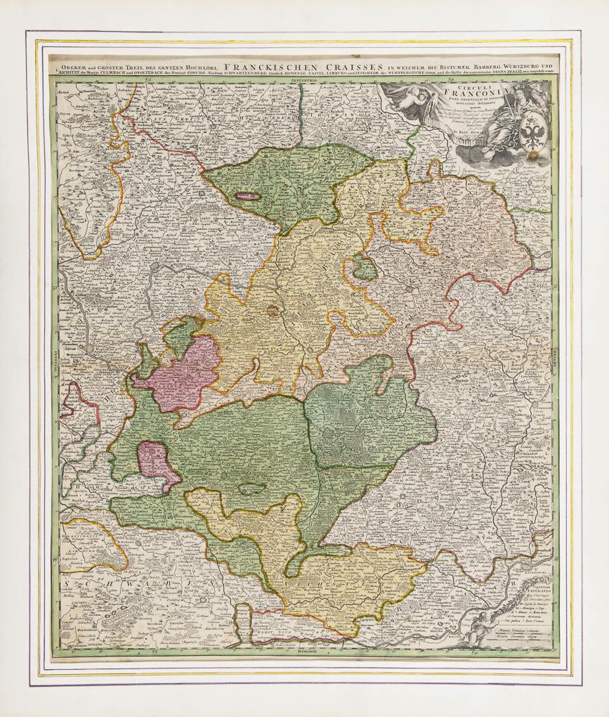 Detailreiche historische Karte des des Fränkischen Reichskreises, figürliche Titelkartusche "Circuli Franconiae Pars Orientalis et Potior novissime delineata [...]" und Meilenzeiger, bezeichnet "Erster und gröster Theil des gantzen hochlöbl. Aichstett, die Marggr. Culmbach und Onoltzbach, das Hertzogt. Coburg, Fürstent. Schwartzenberg, Graffsch. Hohenlo, Castell Limburg und Seinsheim, das Nürnbergischee Gebiet und die Hälfte der angrenzenden Obern Pfaltz mit vorgestelt werde.". Stockfleckig, Bugfalte, griff- und knickspurig.