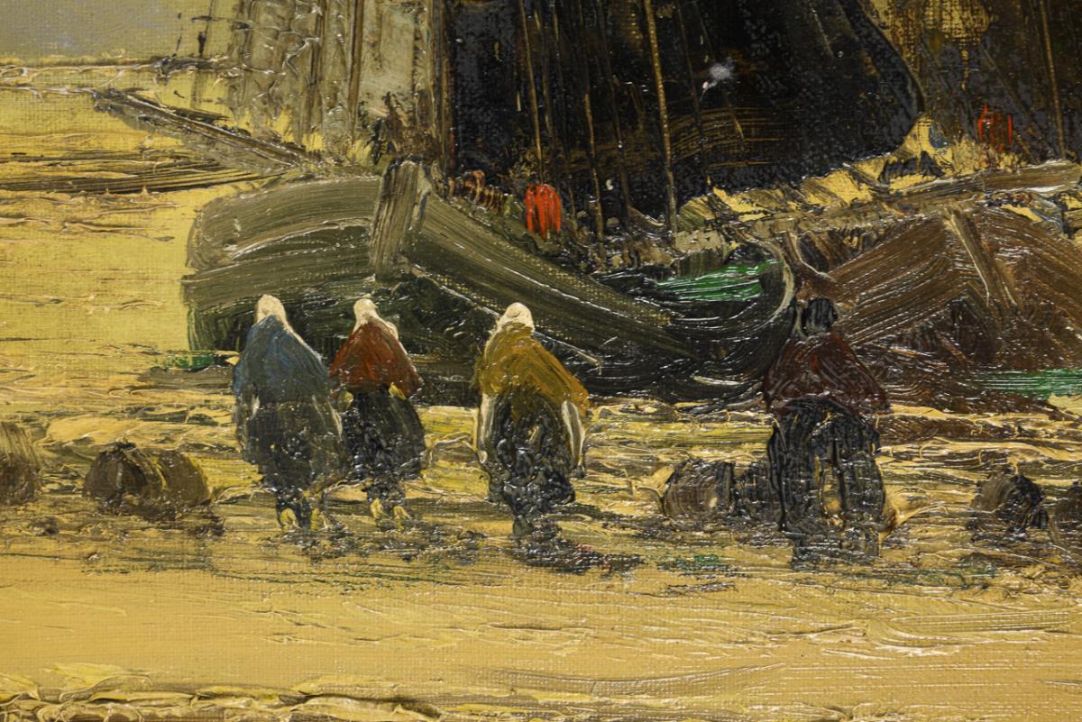 Die Fischer bei Ebbe nahe den Booten im hellen Licht. Zwei restaurierte Stellen mit Hinterklebungen.