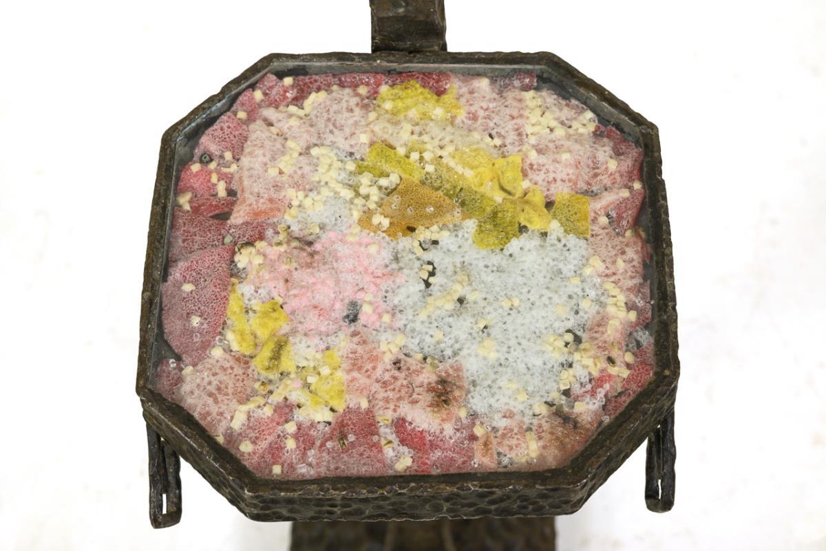 Reich verzierte - in Anlehnung an sogenannte Grottenmöbel - 1-flammige Stehlampe auf geradem Schaft mit Hammerschlagdekor, verglaster Ablagefläche mit polychromem Steindekor und quadratischem Sockel mit 4 volutierten Füßen, zapfenförmiger Glasschirm. Glasrand mit kleinen Chips.