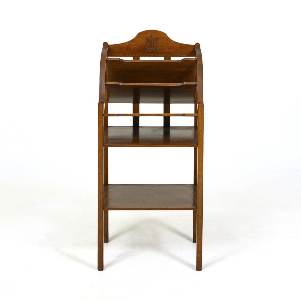 Eleganter, verstrebter Ständer mit 5 fächerförmig angeordneten Ablageflächen für Notenblätter und Zeitungen, dezent dekoriert mit Reliefschnitzerei in Form einer Lyra. Wohnfertig restauriert.