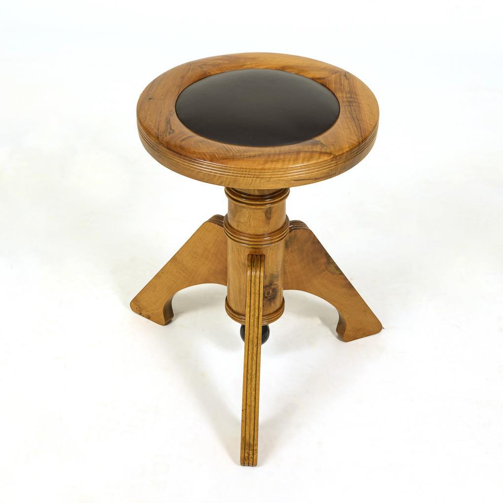 Runder Hocker auf Mittelstütze mit 3 ausgestellten Beinen, akzentuiert mit Kannelurendekor; höhenverstellbare Sitzfläche durch Spiralfeder, schwarzer Lederbezug. Wohnfertig restauriert.